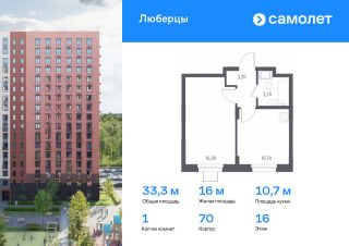 Предлагаются 1-комнатные апартаменты комфорт-класса 33,3 кв.м в корпусе 70 на 16 этаже, в ''Люберцы''Апартаменты с предчистовой отделкой. Доступность дополнительных опций уточняйте у застройщика.Прописка не предусмотрена в рамках юридического статуса - апартаменты.Приобрести апартаменты возможно по специальным акциям от застройщика, с текущими условиями акций можно ознакомиться в блоке Акций.Цена динамическая и может отличаться, уточняйте актуальность у застройщика.Люберцы — проект из 70 домов на границе с Москвой. Часть зданий стоит на берегу озера Черное, из окон с высоты 1517 этажей открывается вид на воду и Салтыковский лесопарк.