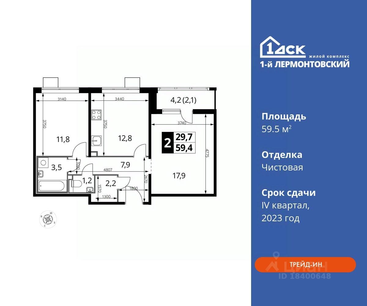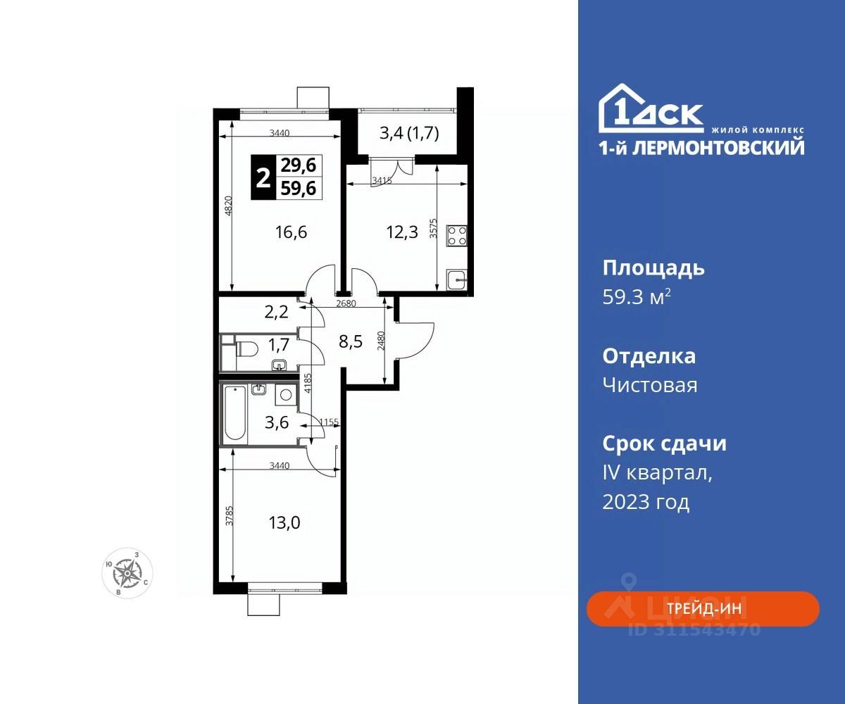 Максимальные скидки при 100% оплате. Корпус сдан! Прямая продажа от застройщика! Жилой Комплекс класса Комфорт плюс. Продаётся 2-к квартира номер 463 в сданном корпусе общей площадью 59.3 кв.м на 21-м этаже 22 этажного дома. Особенности: - Квартира доступна к покупке в Trade-In. - Распашная планировка - отличное сочетание удобства и свободы. - Раздельный санузел - Линейная кухня - функциональность и практичность в одном решении. - Ограниченное количество квартир на этаже - комфорт и уют без лишней суеты. - Кладовая - дополнительное пространство для хранения. - Ниша под шкаф - компактное и удобное место для вещей. - Лоджия - уютное место для отдыха и тишины. - Вид из окна: двор - Вид из окна на сквер Расположение комплекса: Ощущение уютного дома должно начинаться с подъезда. Мы постарались предусмотреть все нюансы, чтобы наши лифты отвечали самым строгим современным требованиям. Двор без машин, закрытое, безопасное, охраняемое место с удобным доступом для вашего авто, более чистый воздух и гарантированное место для стоянки - и это далеко не преимущества наличия подземного паркинга. А наличие кладовых позволит вам поддерживать идеальный порядок и уют в вашей квартире! ''1-й Лермонтовский'' расположился недалеко от уже сложившегося зеленого окружения - Люберецкого парка и Жулебинского лесопарка, переходящего в природно - исторический парк ''Кузьминки''. Если вы предпочитаете активный семейный отдых на свежем воздухе - в округе мест для него предостаточно. С востока он граничит со столичным районом Некрасовка. С северной стороны - с развитым современным микрорайоном ''Красная Горка''. Удачное расположение дарит жильцам возможность передвижения как на своем автомобиле, так и на общественном транспорте. Транспортная доступность: В шаговой доступности ж/д станция ''Люберцы-1''. 5 минут на автомобиле до станций метро ''Некрасовка'', ''Котельники'', ''Лермонтовский проспект''. Внутренняя инфраструктура: Свободно перемещайтесь по внутренней территории в безбарьерной среде! На территории комплекса созданы все условия как для активного образа жизни, так и для спокойного времяпрепровождения: - игровые площадки для детей разного возраста. - площадки воркаута, спортивные комплексы с зонами для детского и взрослого спорта. - зоны отдыха с пешеходными дорожками и аллеями. Также, к вашим услугам: 4 общеобразовательные школы, 7 детских садов, спортивные и танцевальные, школы, поликлиники, множество магазинов и супер-маркетов, включая Ашан и несколько крупных ТЦ в шаговой доступности. Цены указаны с учетом скидки.