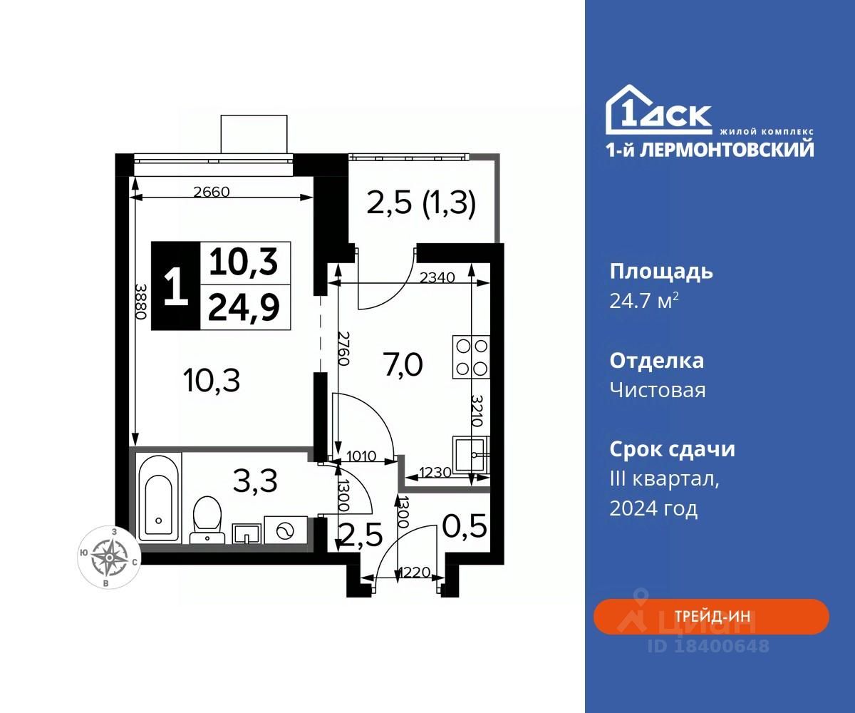 Максимальные скидки при 100% оплате. Корпус сдан! Прямая продажа от застройщика! Жилой Комплекс класса Комфорт плюс. Продаётся студия номер 231 в сданном корпусе общей площадью 24.7 кв.м на 10-м этаже 24 этажного дома. Особенности: - Квартира доступна к покупке в Trade-In. - Линейная планировка - максимальная функциональность и удобство. - Увеличенное число окон - Стандартное количество квартир на этаже - оптимальный выбор для городской жизни. - Ниша под шкаф - компактное и удобное место для вещей. - Лоджия - уютное место для отдыха и тишины. - Вид из окна на детский сад Расположение комплекса: Ощущение уютного дома должно начинаться с подъезда. Мы постарались предусмотреть все нюансы, чтобы наши лифты отвечали самым строгим современным требованиям. Двор без машин, закрытое, безопасное, охраняемое место с удобным доступом для вашего авто, более чистый воздух и гарантированное место для стоянки - и это далеко не преимущества наличия подземного паркинга. А наличие кладовых позволит вам поддерживать идеальный порядок и уют в вашей квартире! ''1-й Лермонтовский'' расположился недалеко от уже сложившегося зеленого окружения - Люберецкого парка и Жулебинского лесопарка, переходящего в природно - исторический парк ''Кузьминки''. Если вы предпочитаете активный семейный отдых на свежем воздухе - в округе мест для него предостаточно. С востока он граничит со столичным районом Некрасовка. С северной стороны - с развитым современным микрорайоном ''Красная Горка''. Удачное расположение дарит жильцам возможность передвижения как на своем автомобиле, так и на общественном транспорте. Транспортная доступность: В шаговой доступности ж/д станция ''Люберцы-1''. 5 минут на автомобиле до станций метро ''Некрасовка'', ''Котельники'', ''Лермонтовский проспект''. Внутренняя инфраструктура: Свободно перемещайтесь по внутренней территории в безбарьерной среде! На территории комплекса созданы все условия как для активного образа жизни, так и для спокойного времяпрепровождения: - игровые площадки для детей разного возраста. - площадки воркаута, спортивные комплексы с зонами для детского и взрослого спорта. - зоны отдыха с пешеходными дорожками и аллеями. Также, к вашим услугам: 4 общеобразовательные школы, 7 детских садов, спортивные и танцевальные, школы, поликлиники, множество магазинов и супер-маркетов, включая Ашан и несколько крупных ТЦ в шаговой доступности. Цены указаны с учетом скидки.