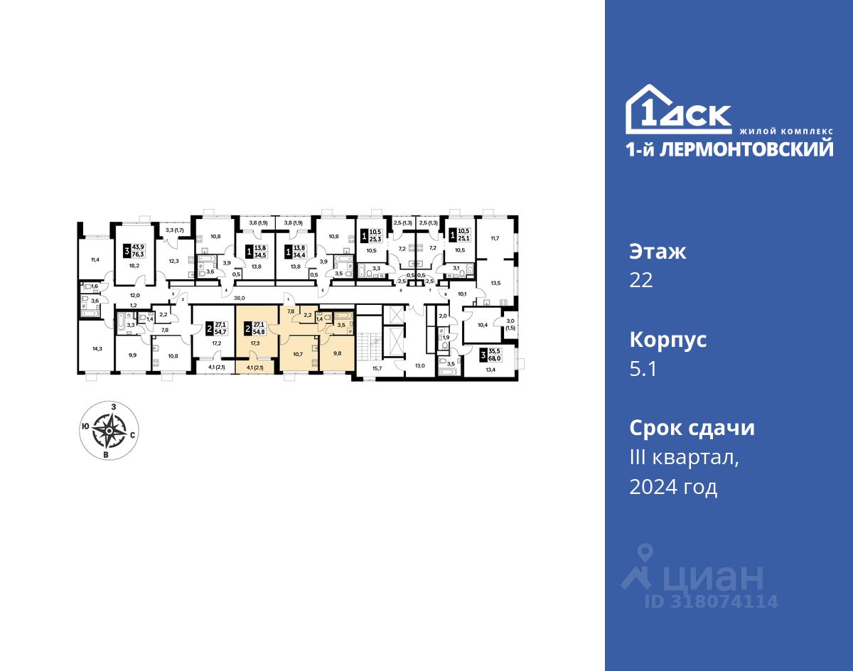 54 м² · Этаж 22 из 24