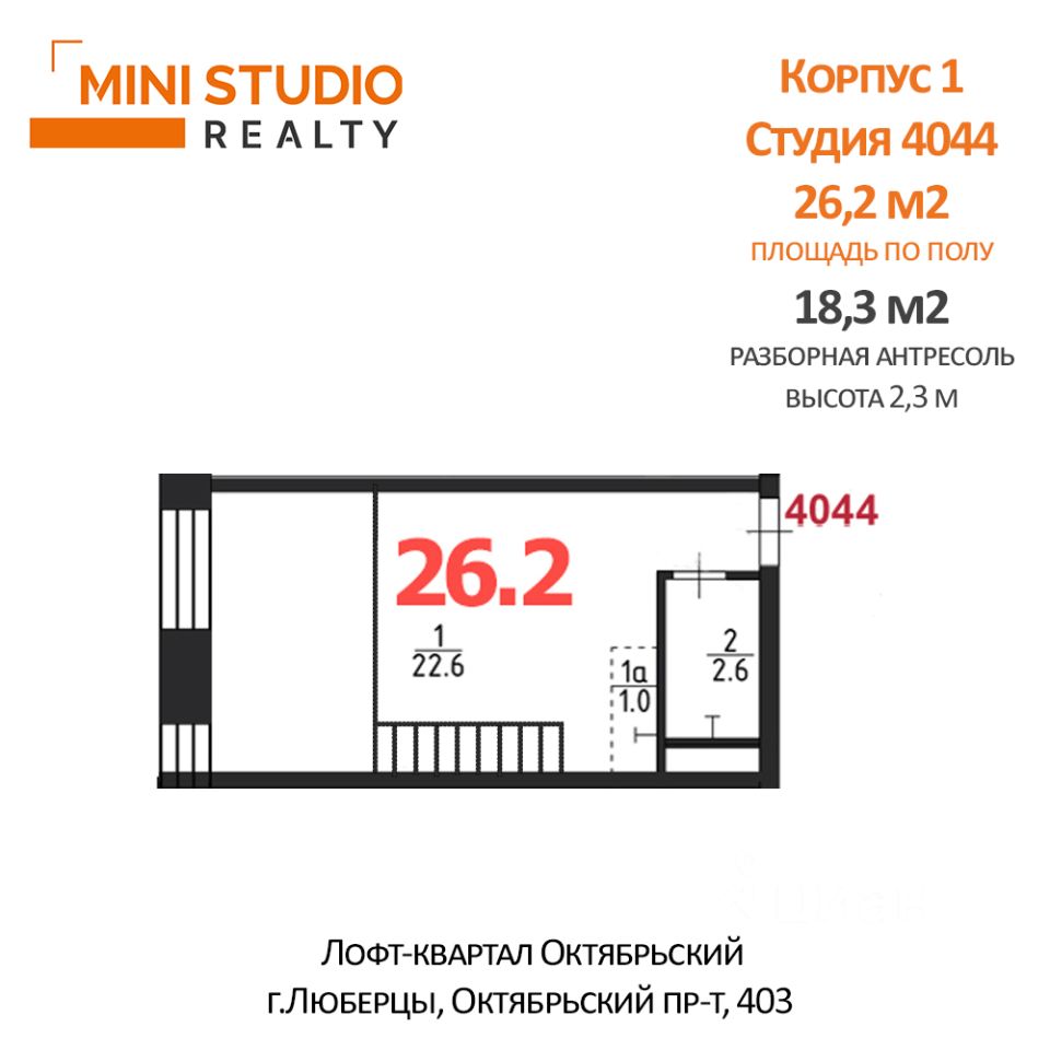 Студия с антресолью без отделки на 4 этаже лофт-квартала Октябрьский! Продается светлая двухуровневая студия с большой разборной антресолью в подмосковном городе Люберцы. Площадь по полу 26,2 кв.м, площадь антресоли 18,3 кв.м, суммарная эксплуатируемая площадь 44,5 кв.м. Фактически евродвушка! Антресоль разборная, но каркас, включая лестничный марш, уже смонтированы. Высота второго уровня без отделки 2,3 м., после проведения отделочных работ останется примерно 2 м, что вполне комфортно для размещения полноценной спальни. Здание после ремонта: качественные материалы, современный дизайн, просторные холлы, новое лифтовое оборудование. Собственная огороженная охраняемая территория с парковкой - В холле расположено лобби со стойкой ресепшн и лаунж зоны. При входе предусмотрено место хранения детского транспорта и колясок - Спортивный зал, хамам, зона коворкинга всё для комфортного проживания - На огороженной безопасной зеленой территории расположены спортивная площадка и места отдыха, оборудован паркинг Красивый двор парк с вековыми вечнозелеными деревьями создает особую загородную атмосферу старинной усадьбы. На огороженной безопасной зеленой территории расположены спортивная площадка и места отдыха, оборудован паркинг. Транспортная доступность: - 15 минут на комфортной электричке D3 до метро Выхино - 20 минут пешком или 7 минут на маршрутном такси 8к - до станции МЦД Панки - На маршрутном такси 44к, 55к или автобусе 44 за 25 минут доехать до метро Котельники Инфраструктура: - Гимназия 20 им. Н.Д. Дугина, Гимназия общеобразовательная школа 8 - Детские сады 59 и 28, частный сад Благополучие - В 10 минутах пешком от комплекса расположен Торговый центр Орбита - В окружении расположены сетевые супермаркеты: Да!, Пятерочка, Дикси - Недалеко расположено центральное отделение Городской Люберецкой больницы, включая поликлинику, травмпункт, детское отделение и один из лучших в Подмосковье Родильный дом Не доля. Выделенный ЕГРН. Продажа по договору купли-продажи, статус нежилое помещение с отдельным кадастровым номером. Оперативный показ и полное сопровождение сделки.