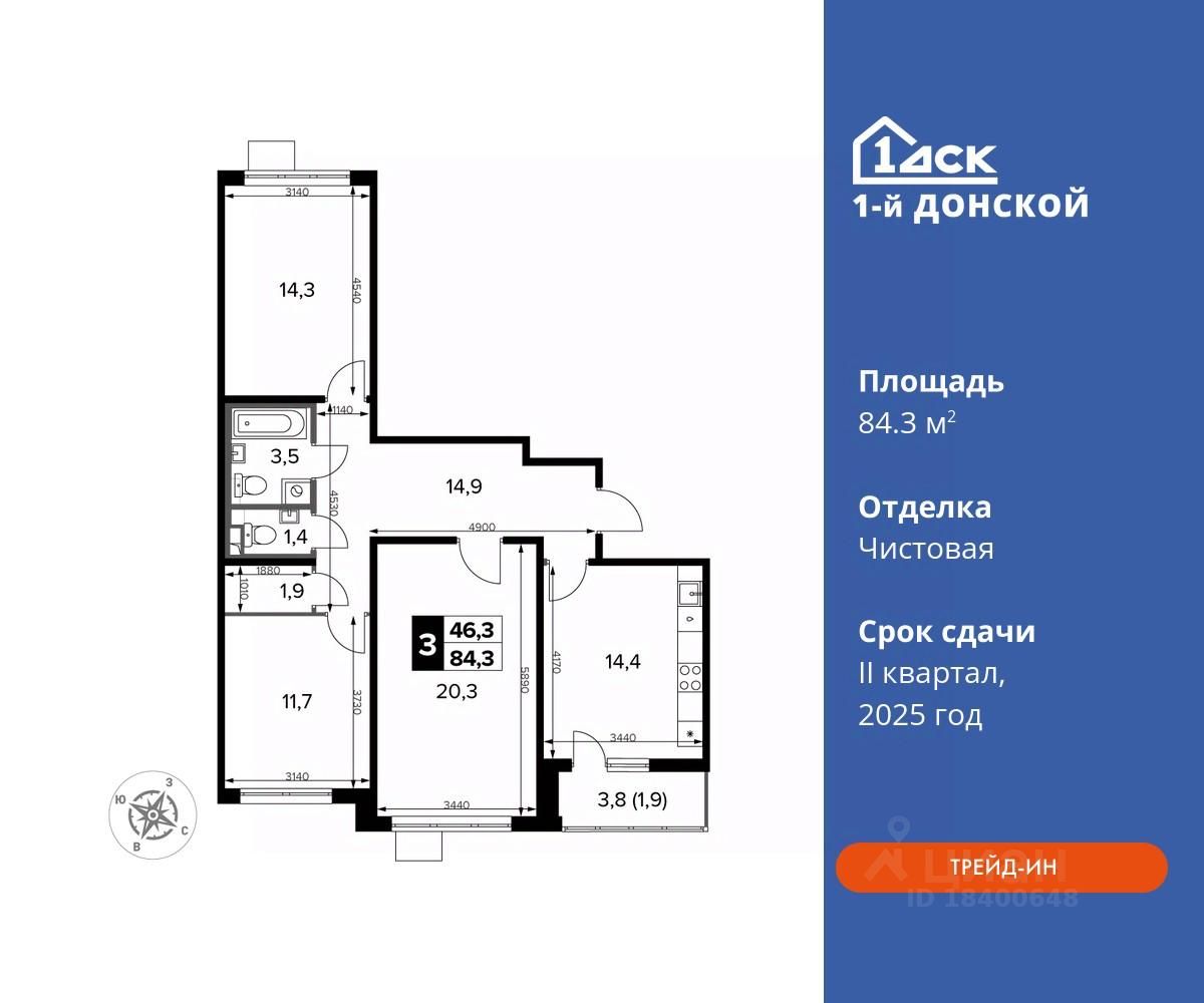 Максимальные скидки при 100% оплате. Trade-in вместо первоначального взноса - выгодно обменяйте вашу квартиру на новую! Корпус сдан! Прямая продажа от застройщика! Жилой Комплекс класса Комфорт плюс. Продаётся 3-к квартира номер 90 в сданном корпусе общей площадью 84.3 кв.м на 14-м этаже 24 этажного дома.