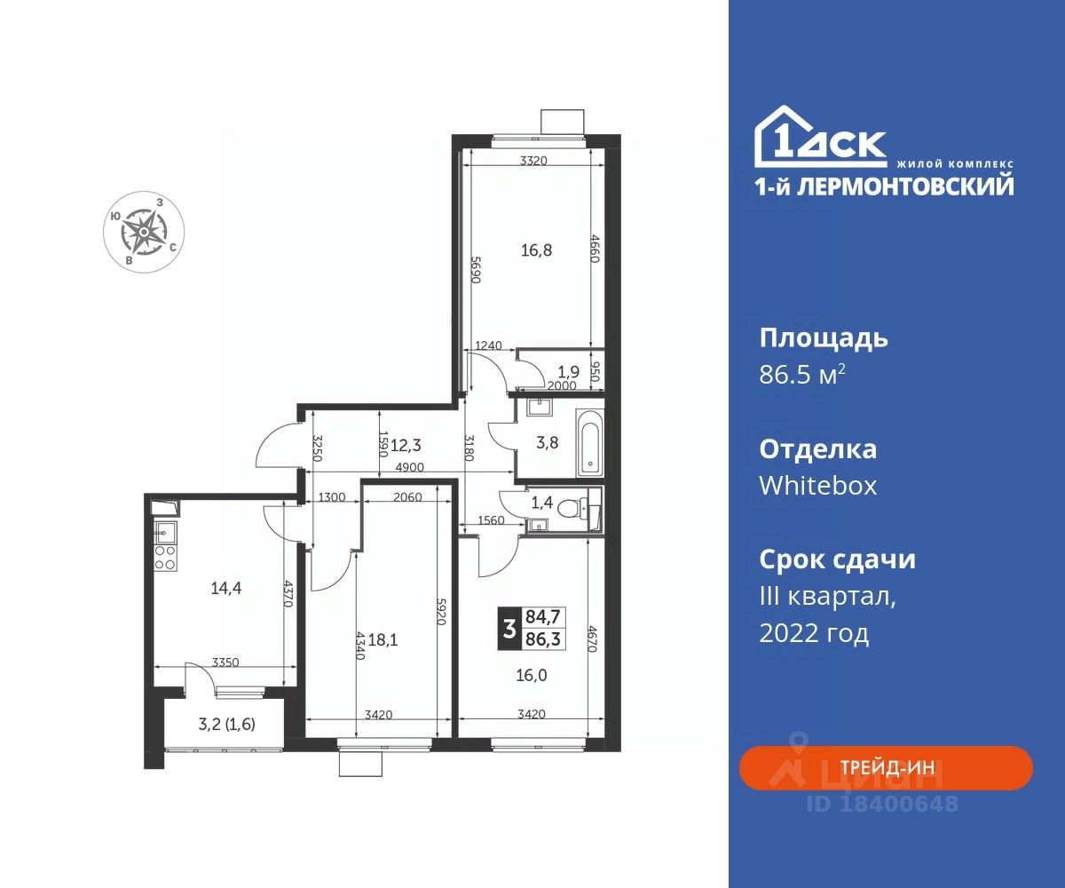 Максимальные скидки при 100% оплате. Корпус сдан! Прямая продажа от застройщика! Жилой Комплекс класса Комфорт плюс. Продаётся 3-к квартира номер 820 в сданном корпусе общей площадью 86.5 кв.м на 14-м этаже 25 этажного дома.