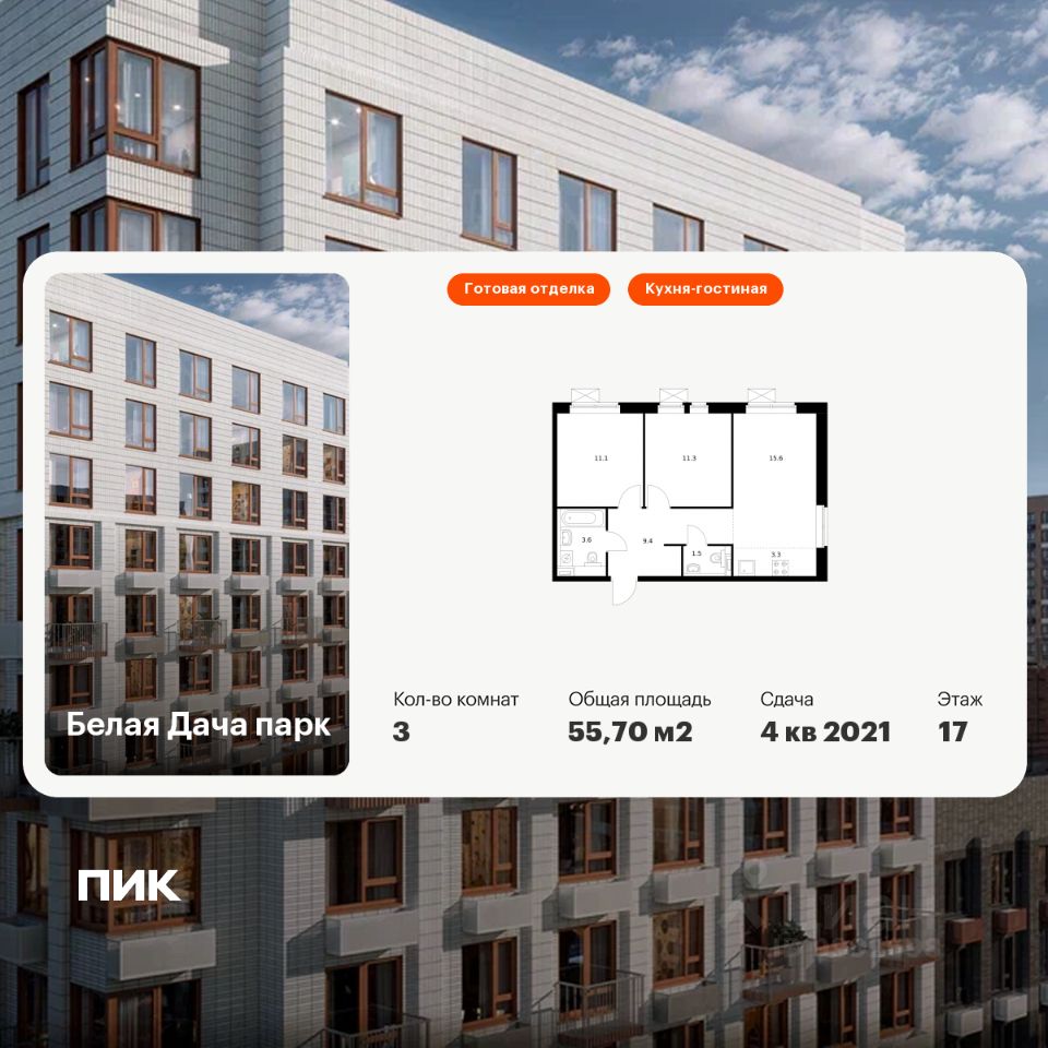 Продаётся 3-комн. квартира площадью 55,7 кв.м на 17 этаже 25 этажного дома (Корпус 19.1, Секция 1) проекта ПИК Белая Дача парк. Светлый просторный подъезд на уровне земли, функциональная планировка, большие окна, c отделкой.
