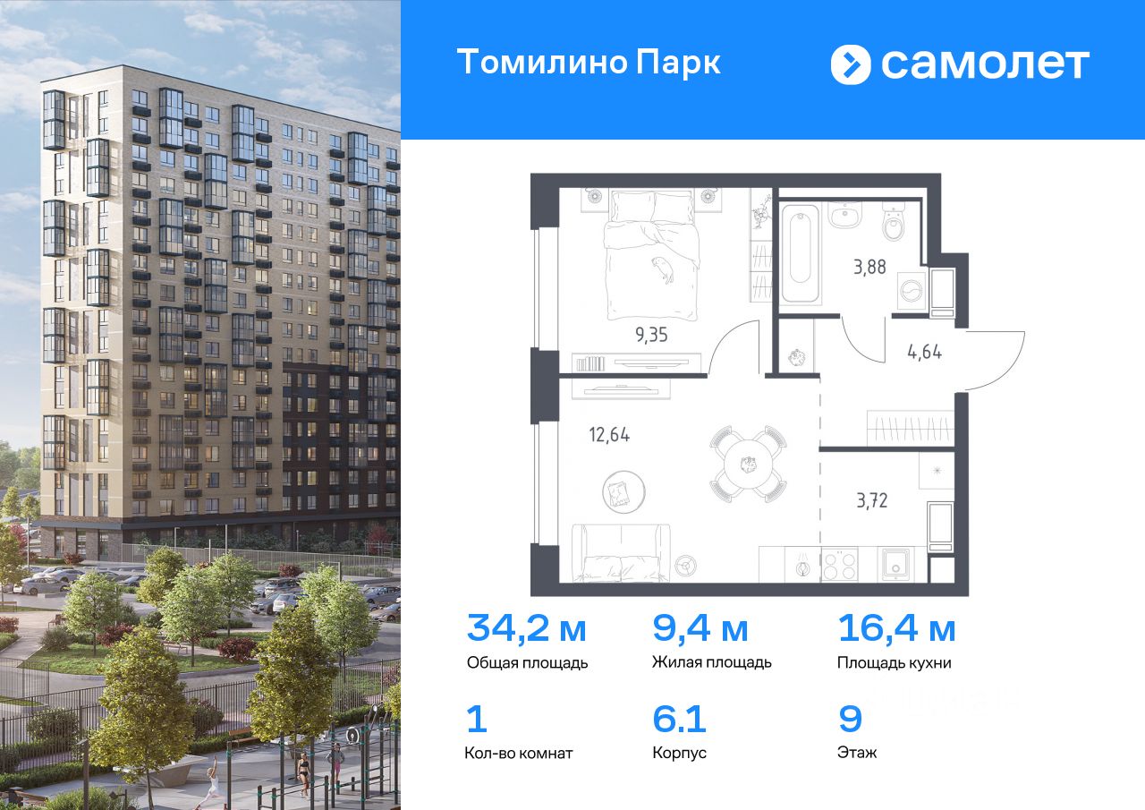 Предлагается 1-комнатная квартира комфорт-класса 34,2 кв.м в корпусе 6.1 на 9 этаже, в ЖК ''Томилино Парк''