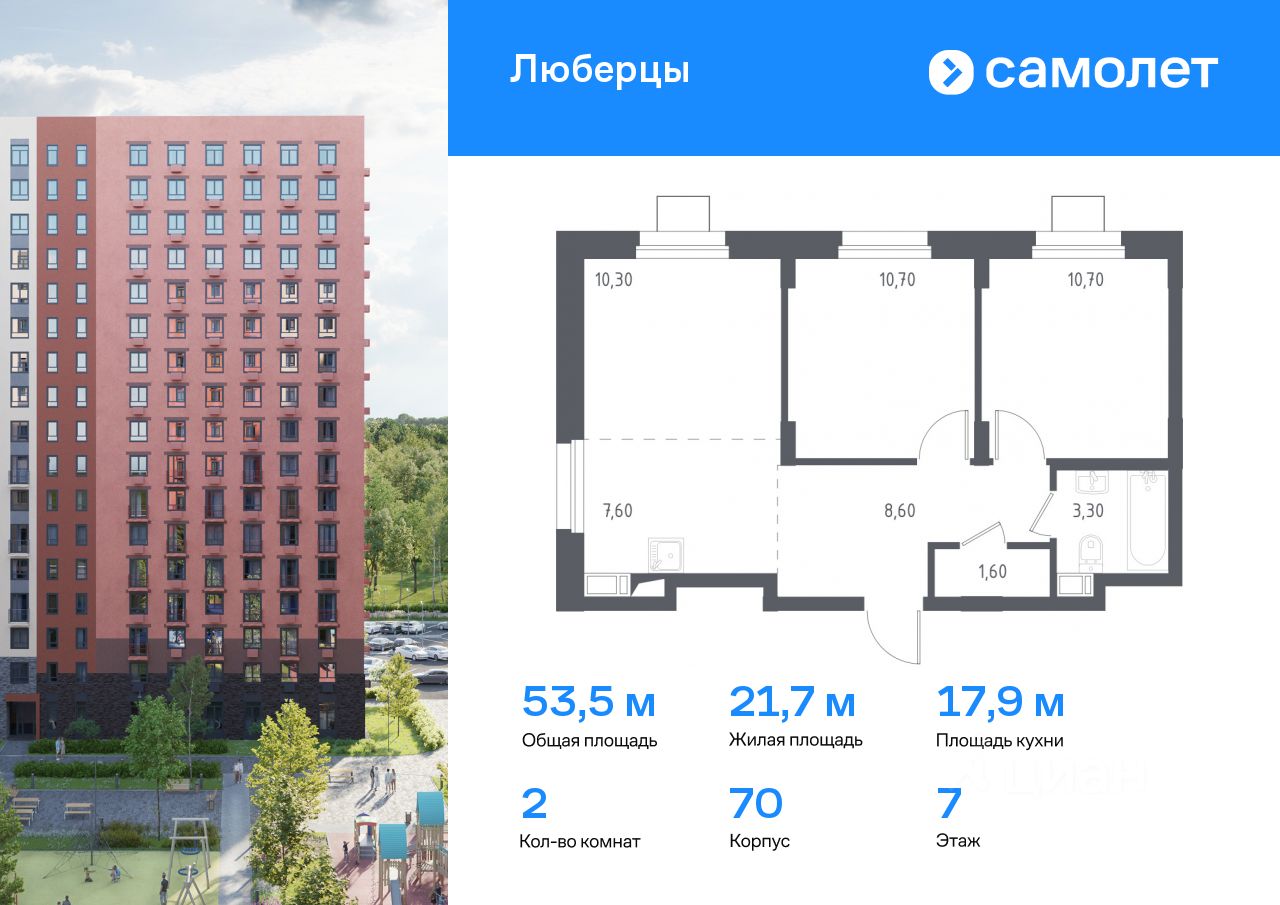 Предлагаются 2-комнатные апартаменты комфорт-класса 53,5 кв.м в корпусе 70 на 7 этаже, в ''Люберцы''