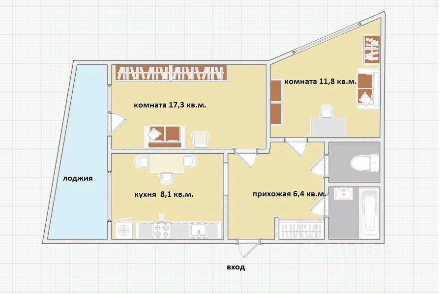 КВАРТИРА - площадь 47,6 кв.м. - 2 изолированные комнаты 11,8 кв.м. и 17,3 кв.м. - кухня 8,1 кв.м. - раздельный санузел - огромная лоджия на всю ширину комнаты и кухни - просторная прихожая 6,4 кв.м. - пластиковые окна во всех помещениях - есть просторный закрывающийся тамбур на 2 квартиры с хорошими соседями