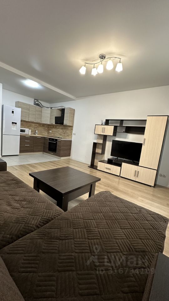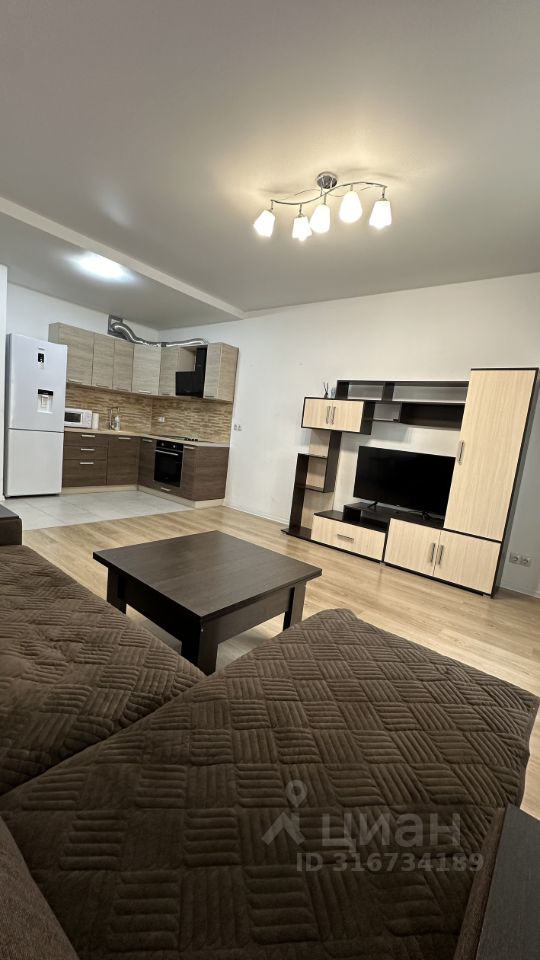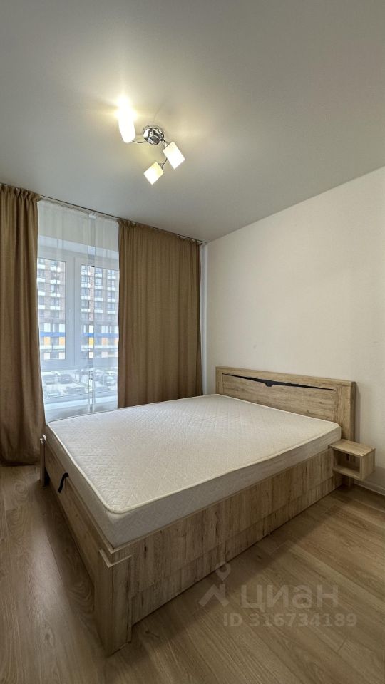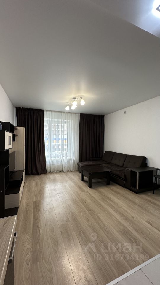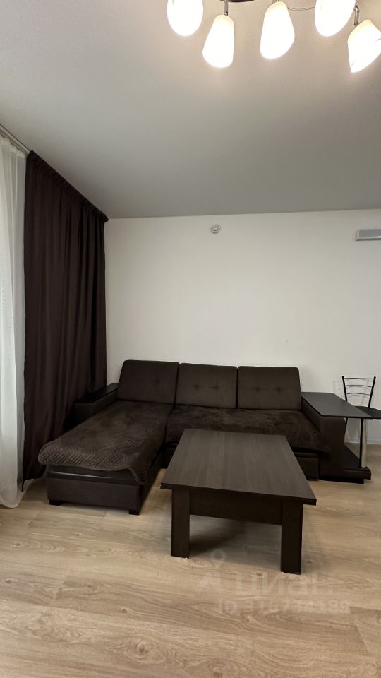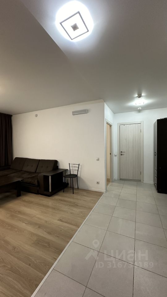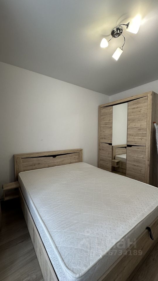 квартира с большой кухней гостиной, где расположен диван , и отдельной изолированной спальней, где расположена кровать .Сверху только счетчики .