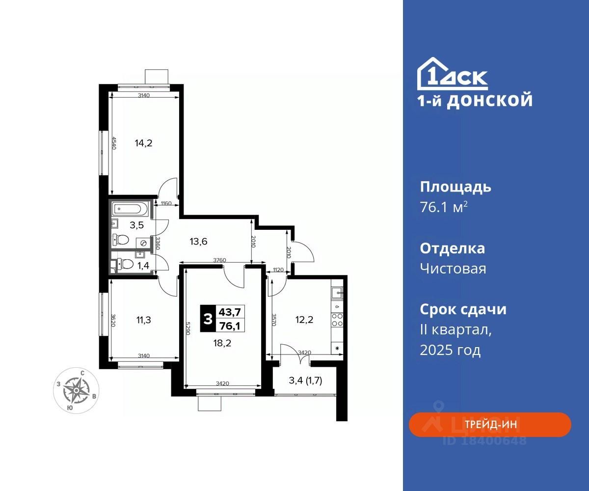 До конца июня скидки на квартиры с отделкой до 28%! Максимальные скидки при 100% оплате. Trade-in вместо первоначального взноса - выгодно обменяйте вашу квартиру на новую! Корпус сдан! Прямая продажа от застройщика! Жилой Комплекс класса Комфорт плюс. Продаётся 3-к квартира номер 161 в сданном корпусе общей площадью 76.1 кв.м на 21-м этаже 21 этажного дома.