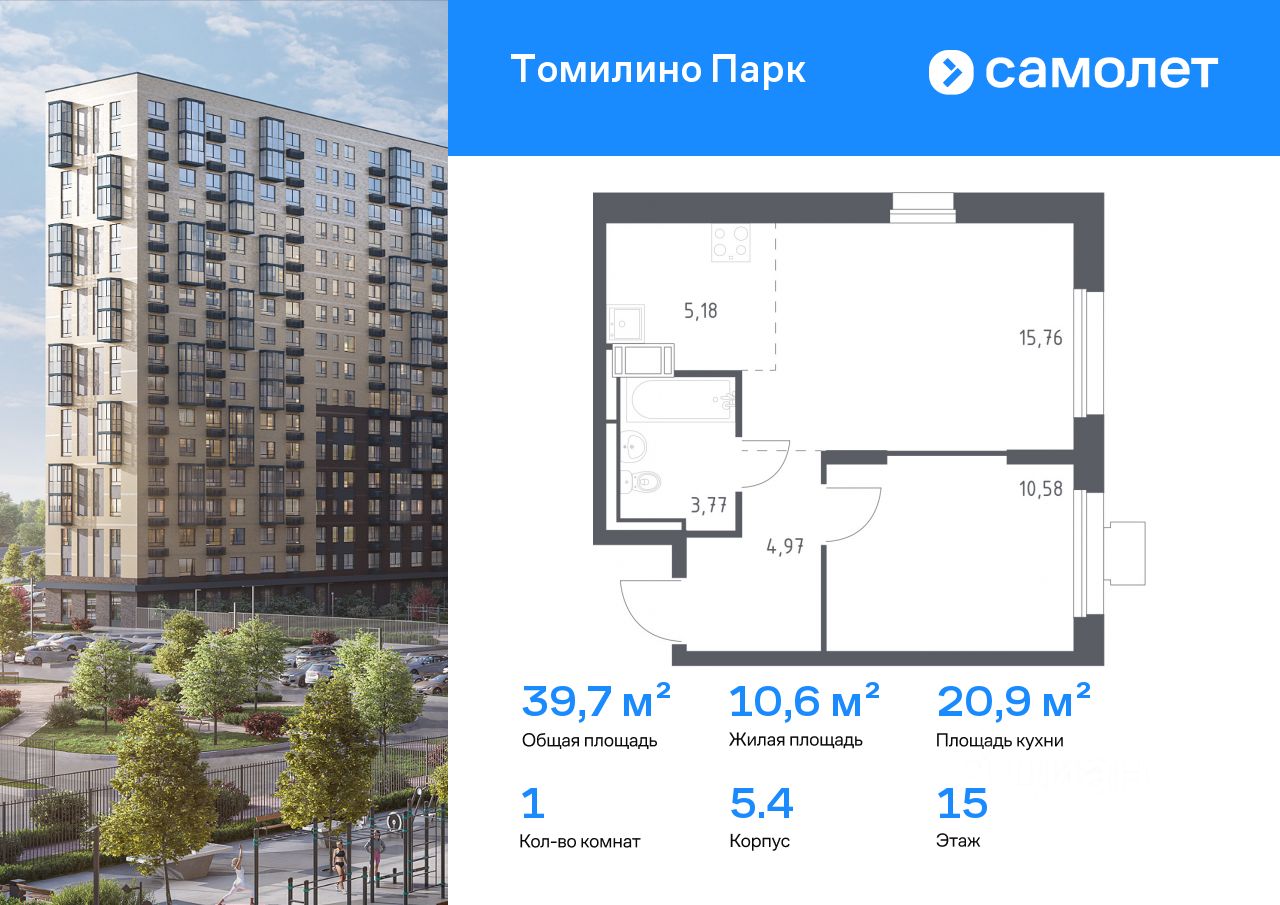 Предлагается 1-комнатная квартира комфорт-класса 39,7 кв.м в корпусе 5.4 на 15 этаже, в ЖК ''Томилино Парк''