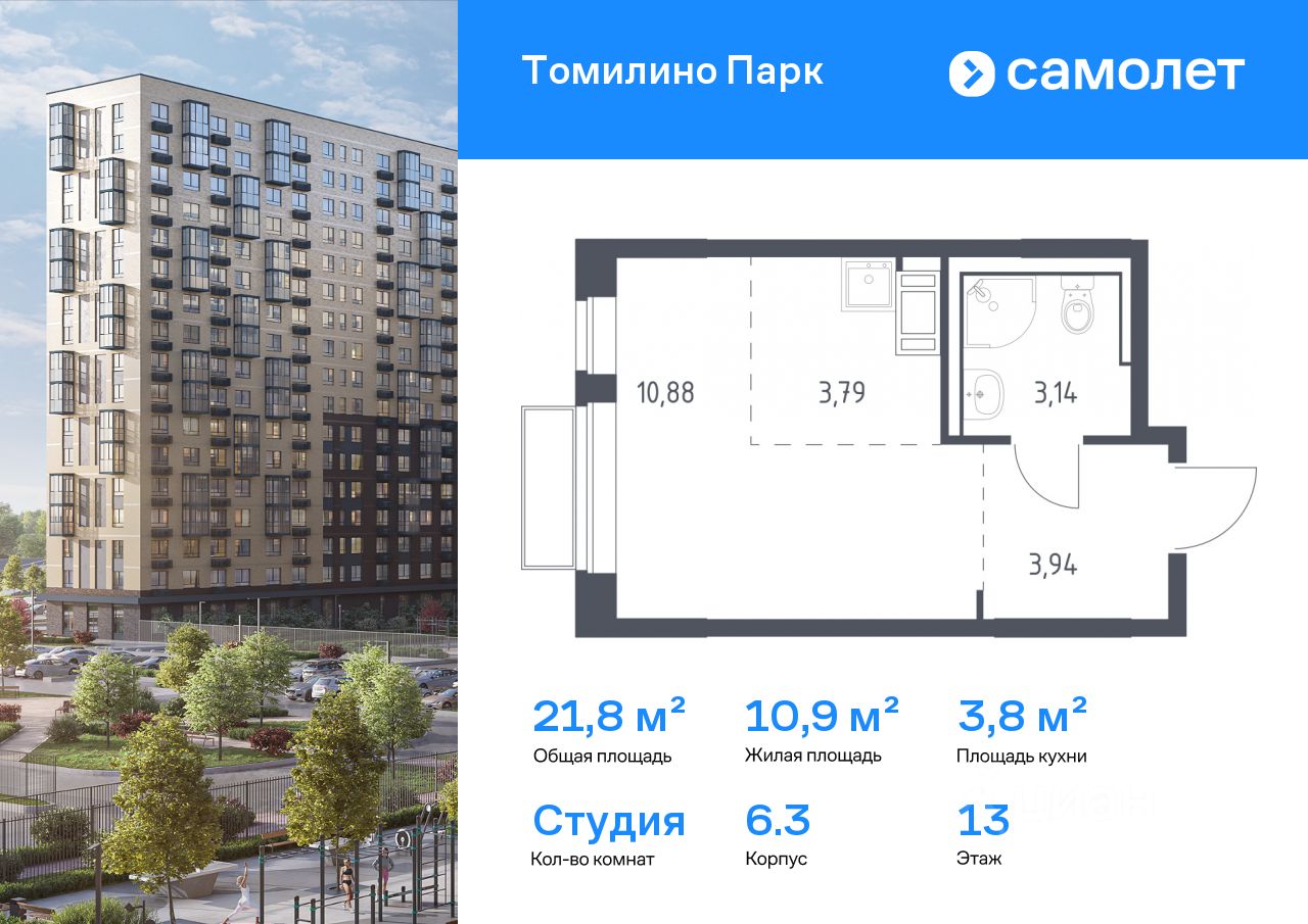 Строим кварталы для жизни с заботой о будущем. Предлагается квартира студия комфорт-класса 21,75 кв.м в корпусе 6.3 на 13 этаже, в ЖК ''Томилино Парк'' Квартира с чистовой отделкой. Доступность дополнительных опций уточняйте у застройщика.