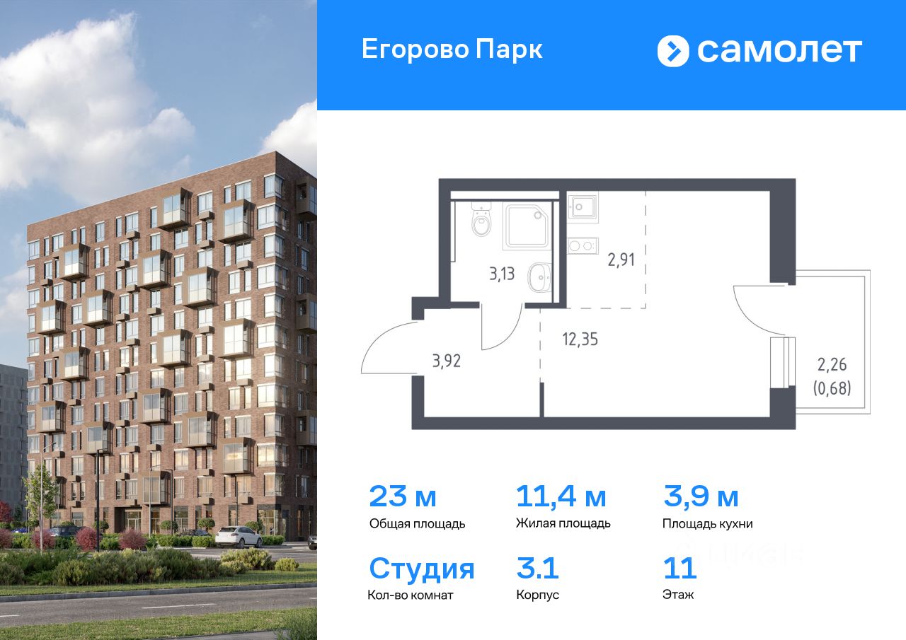 Предлагается квартира студия комфорт-класса 22,99 кв.м в корпусе 3.1 на 11 этаже, в ЖК ''Егорово Парк''