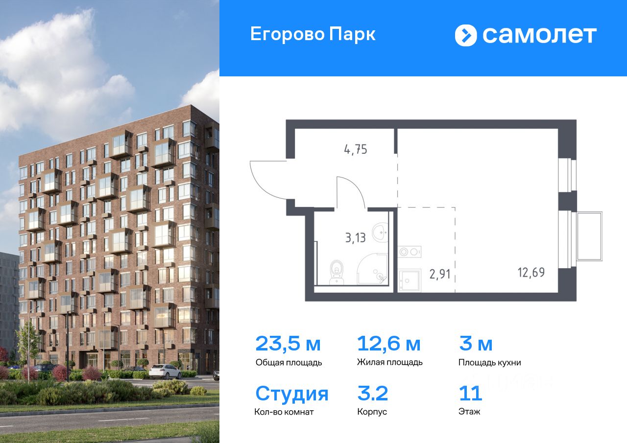 Предлагается квартира студия комфорт-класса 23,48 кв.м в корпусе 3.2 на 11 этаже, в ЖК ''Егорово Парк''