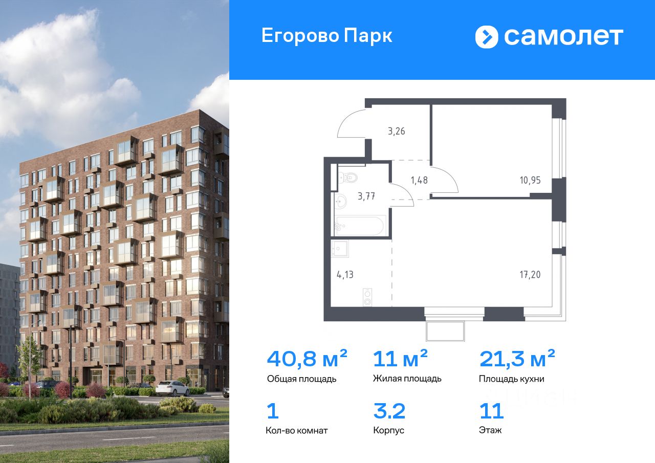 Строим кварталы для жизни с заботой о будущем. Предлагается 1-комнатная квартира комфорт-класса 40,79 кв.м в корпусе 3.2 на 11 этаже, в ЖК ''Егорово Парк''