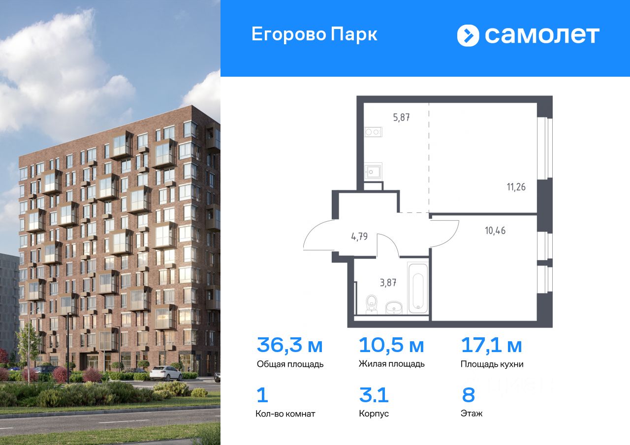 Предлагается 1-комнатная квартира комфорт-класса 36,25 кв.м в корпусе 3.1 на 8 этаже, в ЖК ''Егорово Парк''