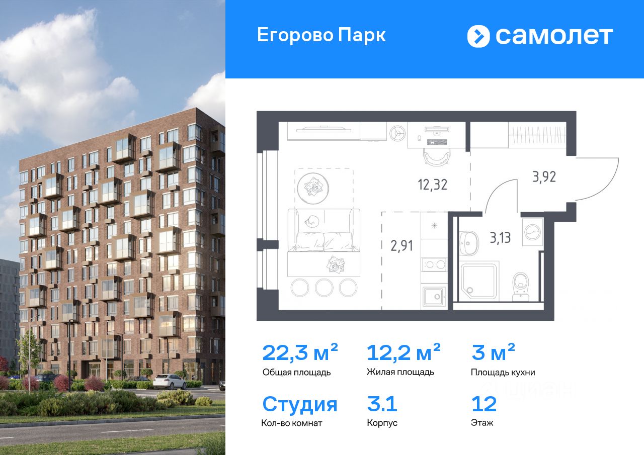 Строим кварталы для жизни с заботой о будущем. Предлагается квартира студия комфорт-класса 22,28 кв.м в корпусе 3.1 на 12 этаже, в ЖК ''Егорово Парк''