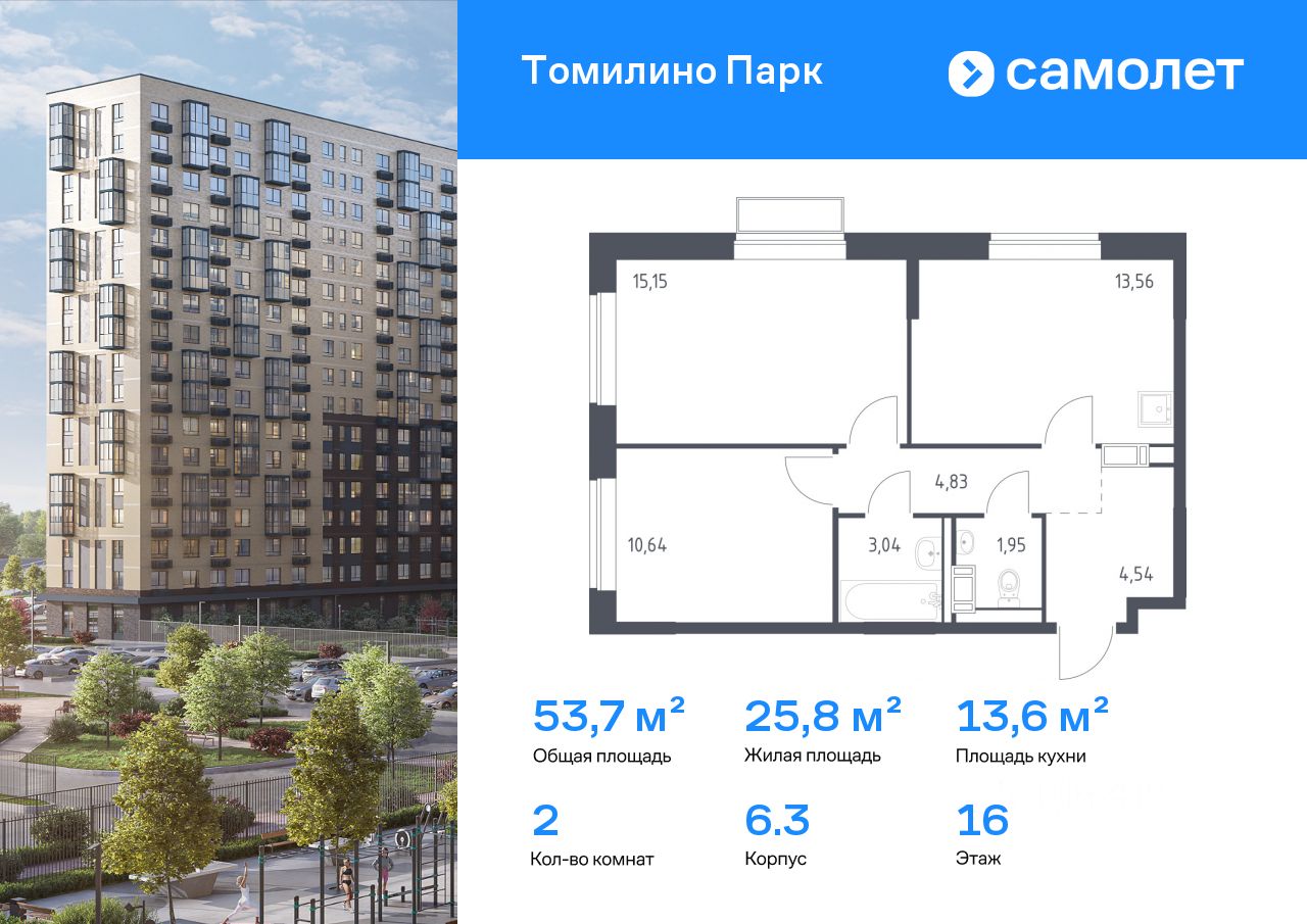 Предлагается 2-комнатная квартира комфорт-класса 53,71 кв.м в корпусе 6.3 на 16 этаже, в ЖК ''Томилино Парк''