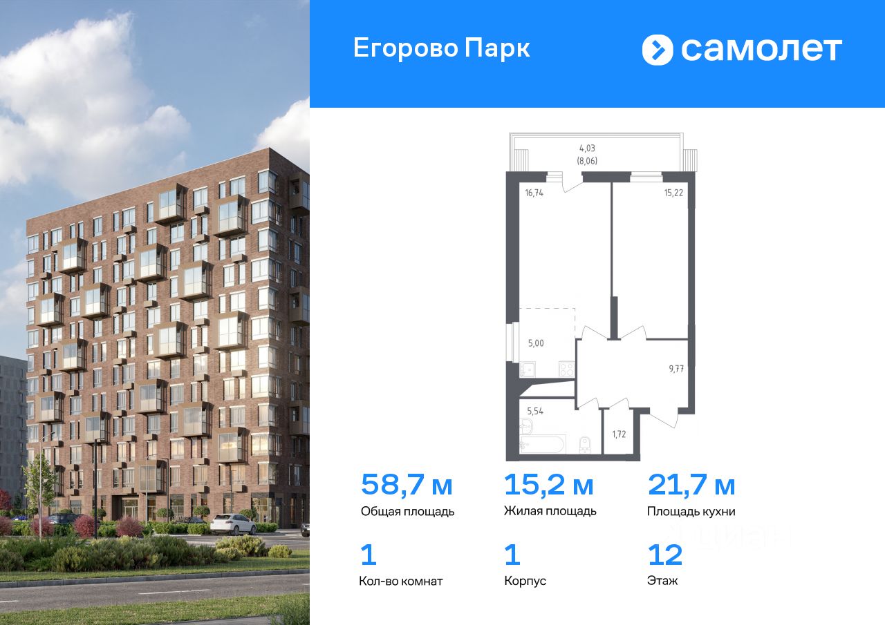 Предлагается 1-комнатная квартира комфорт-класса 58,7 кв.м в корпусе 1 на 12 этаже, в ЖК ''Егорово Парк''