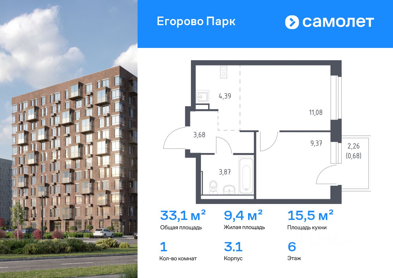 Строим кварталы для жизни с заботой о будущем. Предлагается 1-комнатная квартира комфорт-класса 33,07 кв.м в корпусе 3.1 на 6 этаже, в ЖК ''Егорово Парк''