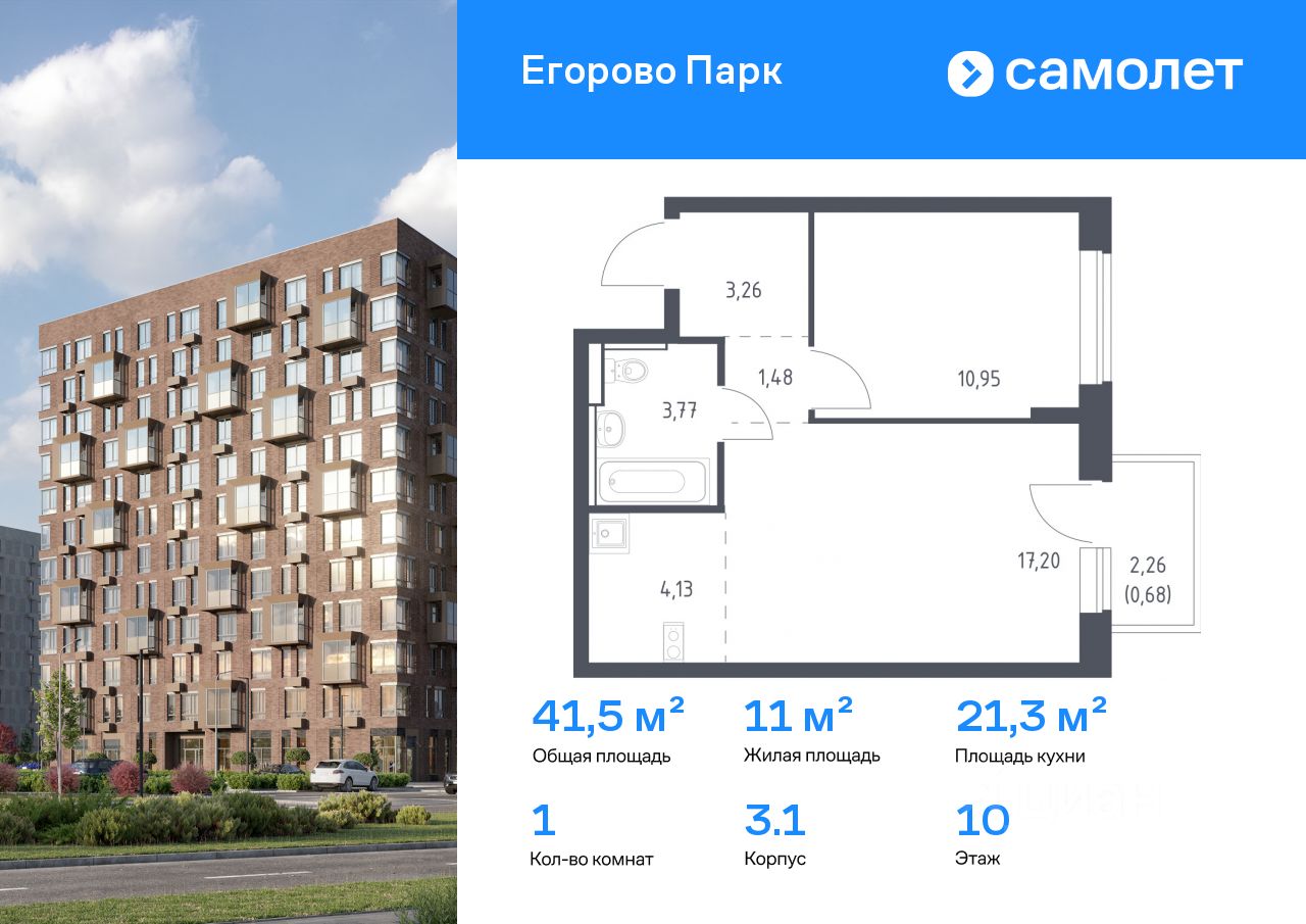 Предлагается 1-комнатная квартира комфорт-класса 41,47 кв.м в корпусе 3.1 на 10 этаже, в ЖК ''Егорово Парк''