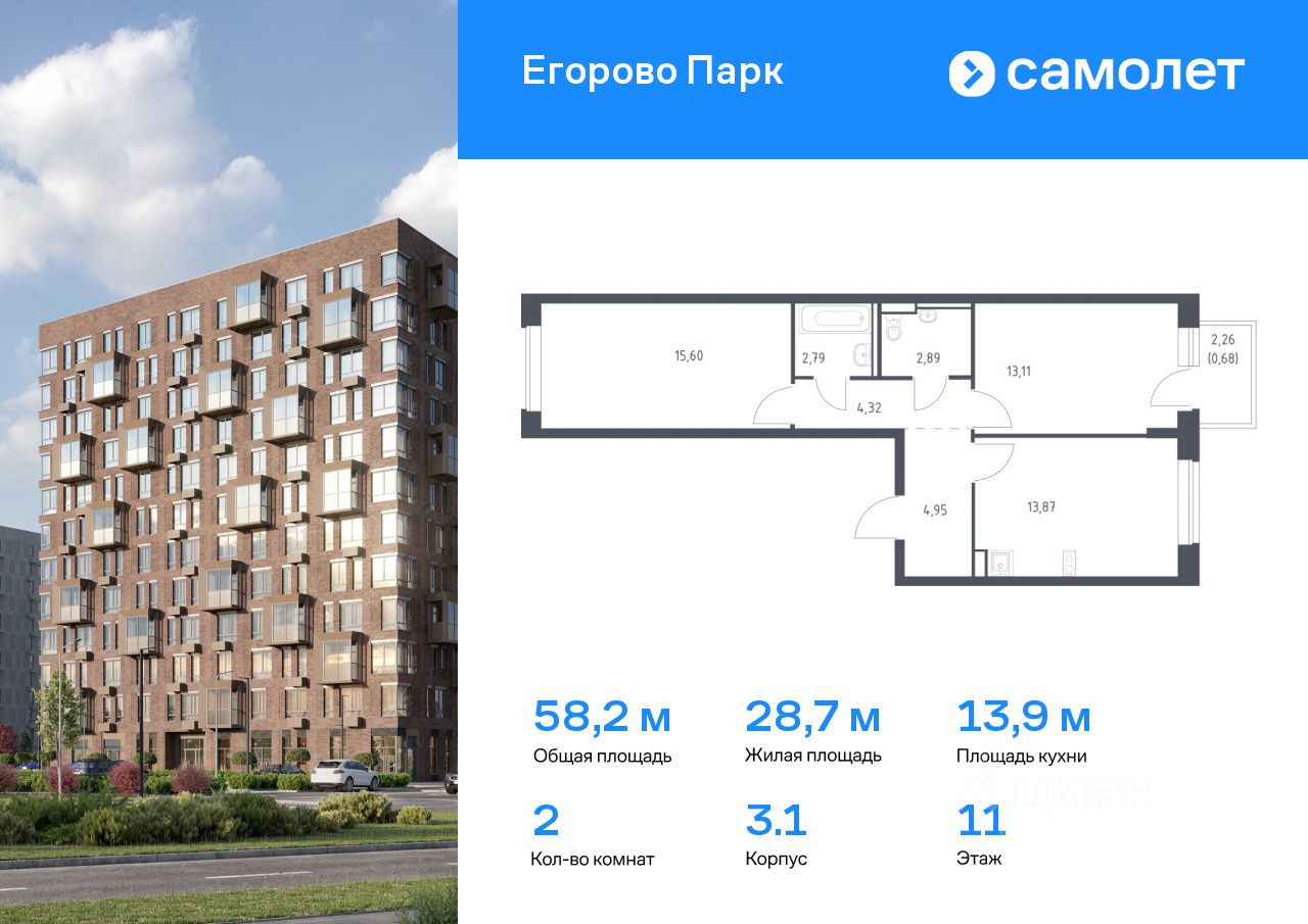 Предлагается 2-комнатная квартира комфорт-класса 58,21 кв.м в корпусе 3.1 на 11 этаже, в ЖК ''Егорово Парк''