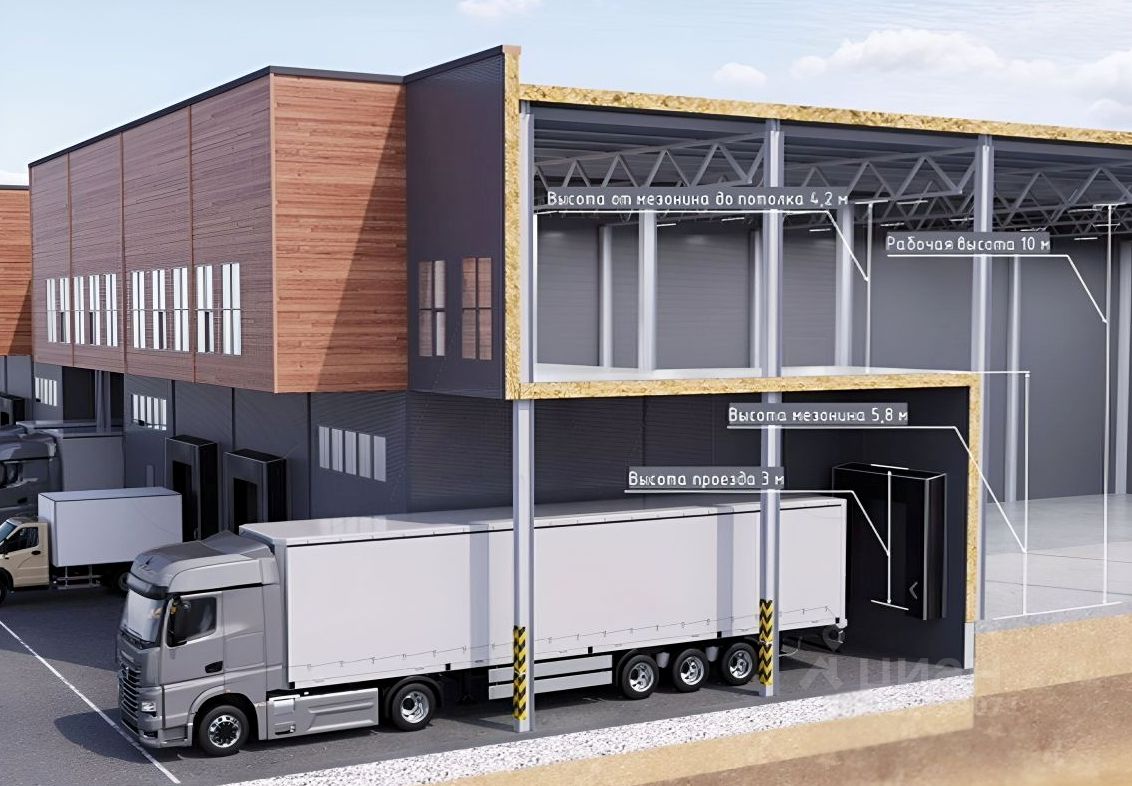 Площадь по полу - 560,4 м2. Антресоль - 131,1 м2. Офисы - 44,7 м2 Полы - антипыль. Нагрузка на пол - 6 т/м2. Нагрузка на антресоль - 500 кг./м2 Нагрузка на офис - 250 кг/м2. Кроссдокинг — есть. Доклевеллеры — разгрузочно-погрузочные доки для фур оборудованы док-левеллерами. Фундамент — столбчатый, бетон В25, вертикальная гидронзоляция (один слой), Каркас из металлоконструкций, Стены — сэндвич-панели с минераловатным утеплителем 120 мм, Пол — фибробстонная плита, толщина 180 мм, бетон В25 двойное армирование,