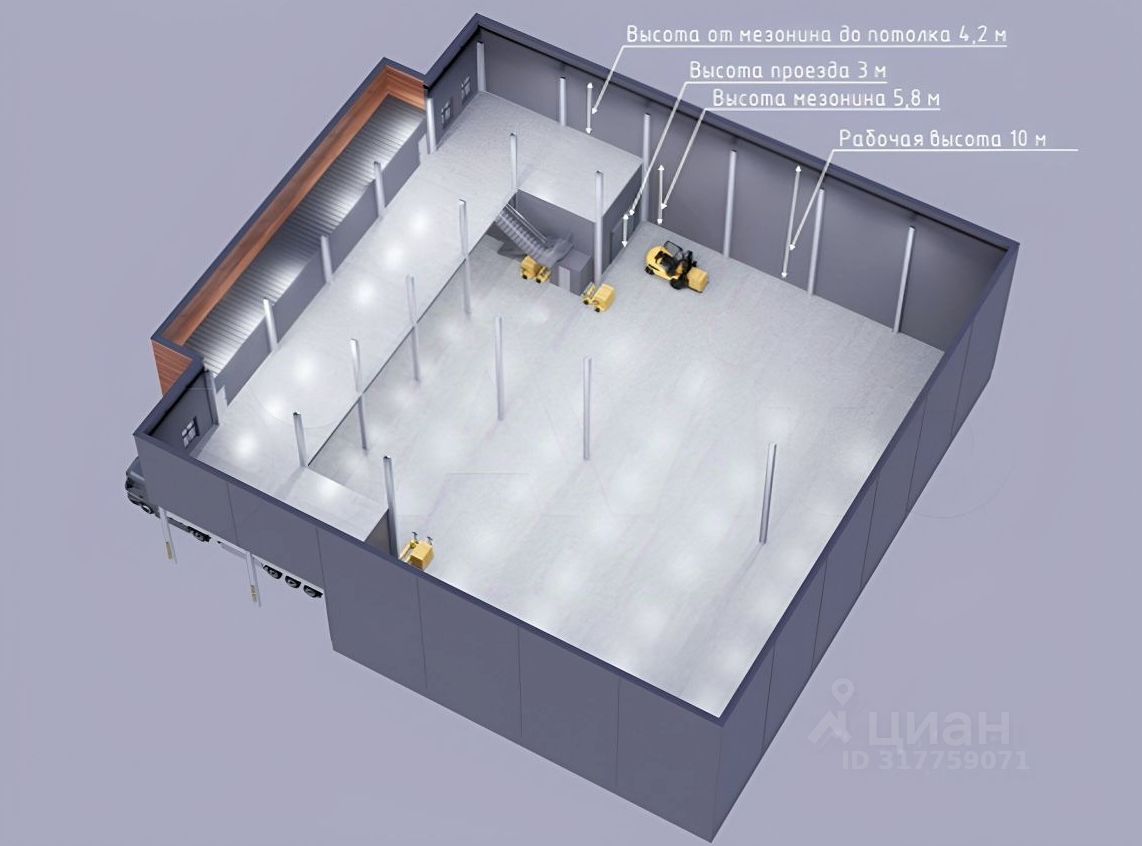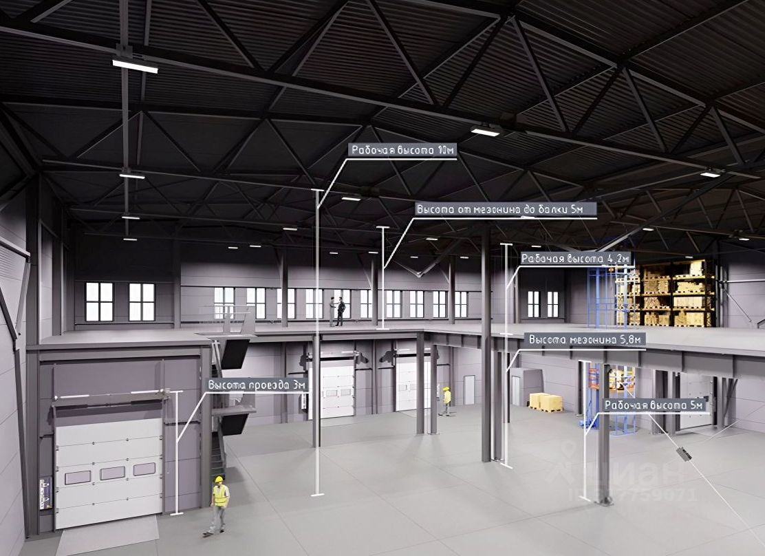 Площадь по полу - 560,4 м2. Антресоль - 131,1 м2. Офисы - 44,7 м2 Полы - антипыль. Нагрузка на пол - 6 т/м2. Нагрузка на антресоль - 500 кг./м2 Нагрузка на офис - 250 кг/м2. Кроссдокинг — есть. Доклевеллеры — разгрузочно-погрузочные доки для фур оборудованы док-левеллерами.