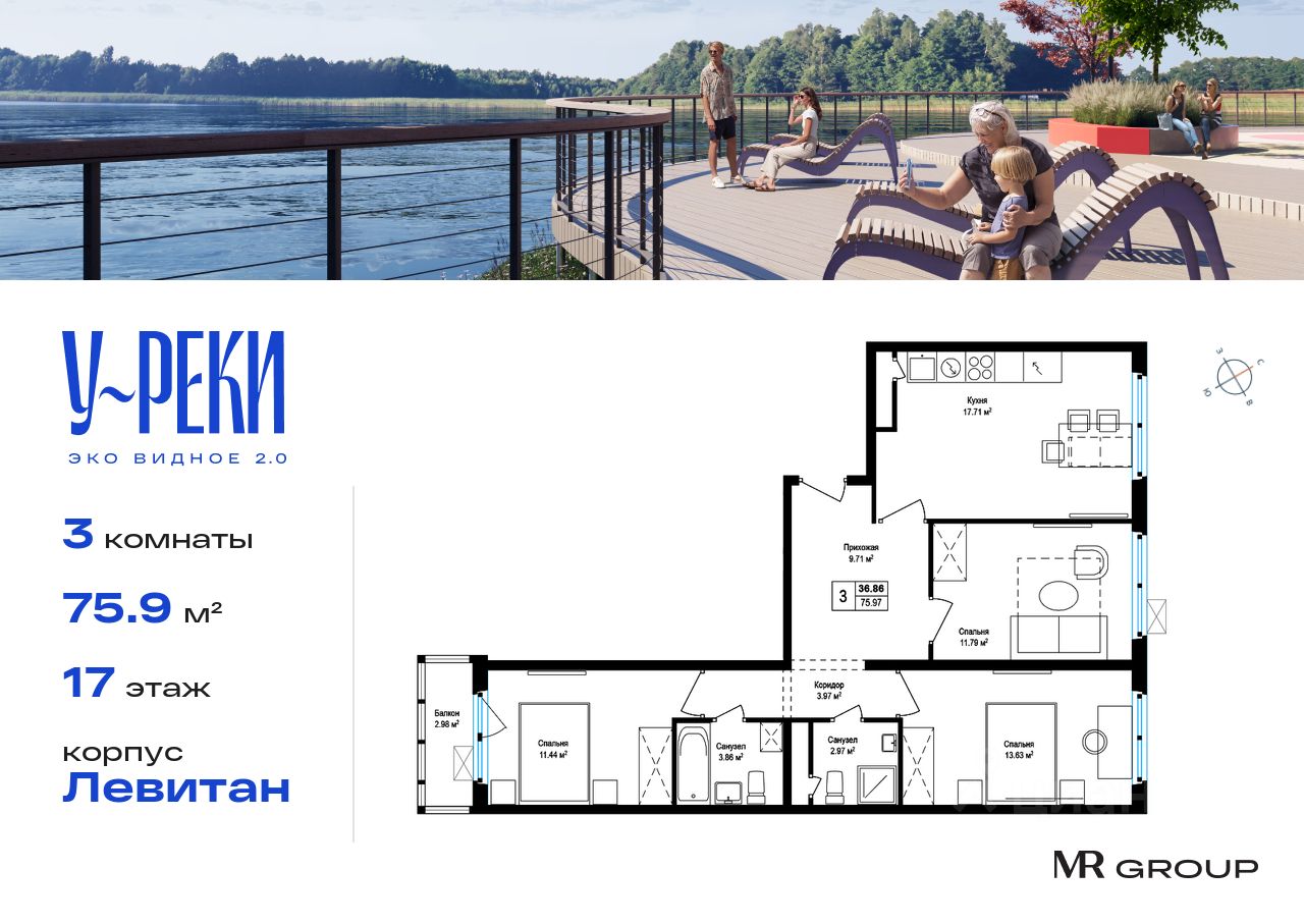 Прямая продажа от застройщика. Продаётся 3-к квартира общей площадью 75.90 кв. м с чистовой отделкой в ЖК ''У реки. Эко Видное 2.0'' на 17-м этаже 17 этажного корпуса Левитан. Все корпуса введены в эксплуатацию. Выдача ключей - II кв. 2025г. Семнадцатиэтажный корпус ''Левитан'' состоит из 13 секций, образующих в плане закрытый периметр двора. Эко-повестка и комфорт — это формат осознанной жизни, разработанный ''Бюро А4'' для благоустройства корпуса ''Левитан''. В проекте развиваются две темы: образ реки и настроения пейзажей Левитана которые раскрываются через четыре функциональные зоны.