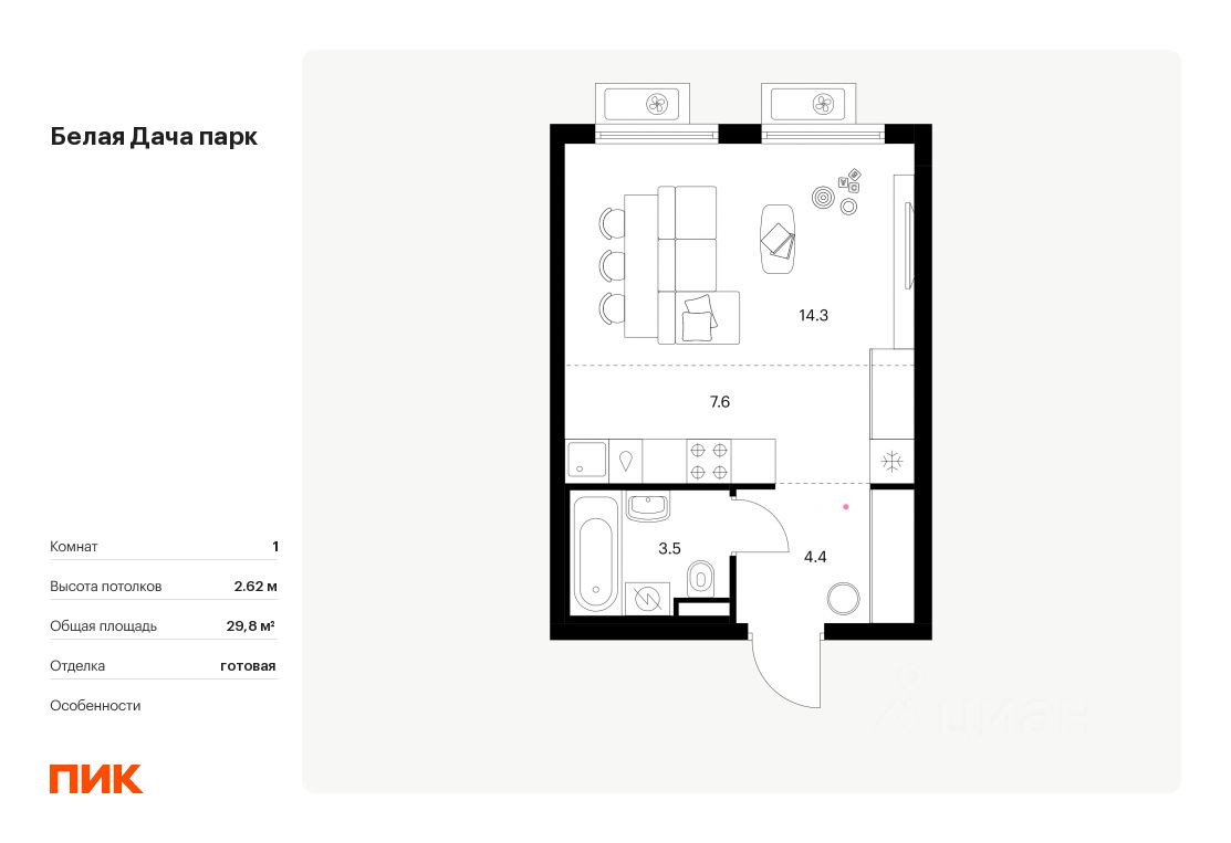 Продаётся квартира-студия площадью 29,8 кв.м на 11 этаже 25 этажного дома (Корпус 16.2, Секция 5) проекта ПИК Белая Дача парк. Светлый просторный подъезд на уровне земли, функциональная планировка, большие окна, c отделкой.