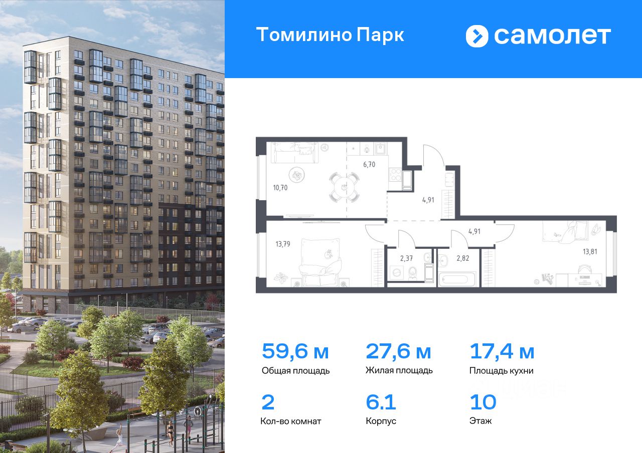 Предлагается 2-комнатная квартира комфорт-класса 59,6 кв.м в корпусе 6.1 на 10 этаже, в ЖК ''Томилино Парк''