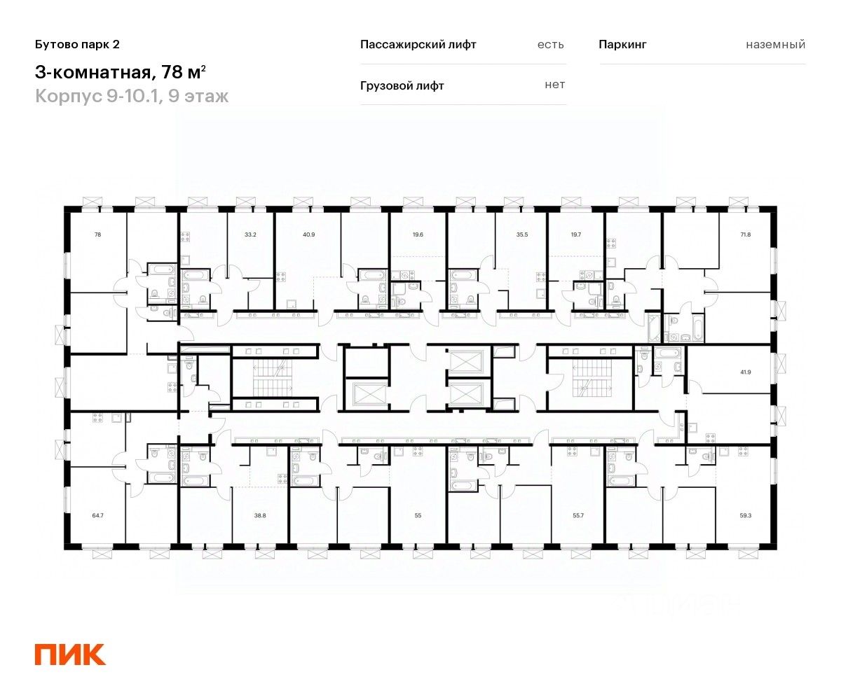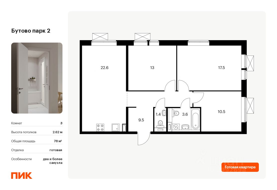 Продаётся 3-комн. квартира площадью 78 кв.м на 9 этаже 17 этажного дома (Корпус 9-10.1, Секция 1) проекта ПИК Бутово парк 2. Светлый просторный подъезд на уровне земли, функциональная планировка, большие окна, c отделкой.