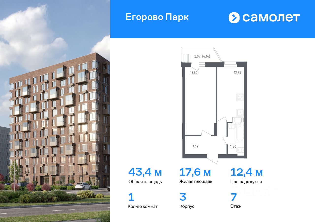 Предлагается 1-комнатная квартира комфорт-класса 43,4 кв.м в корпусе 3 на 7 этаже, в ЖК ''Егорово Парк''