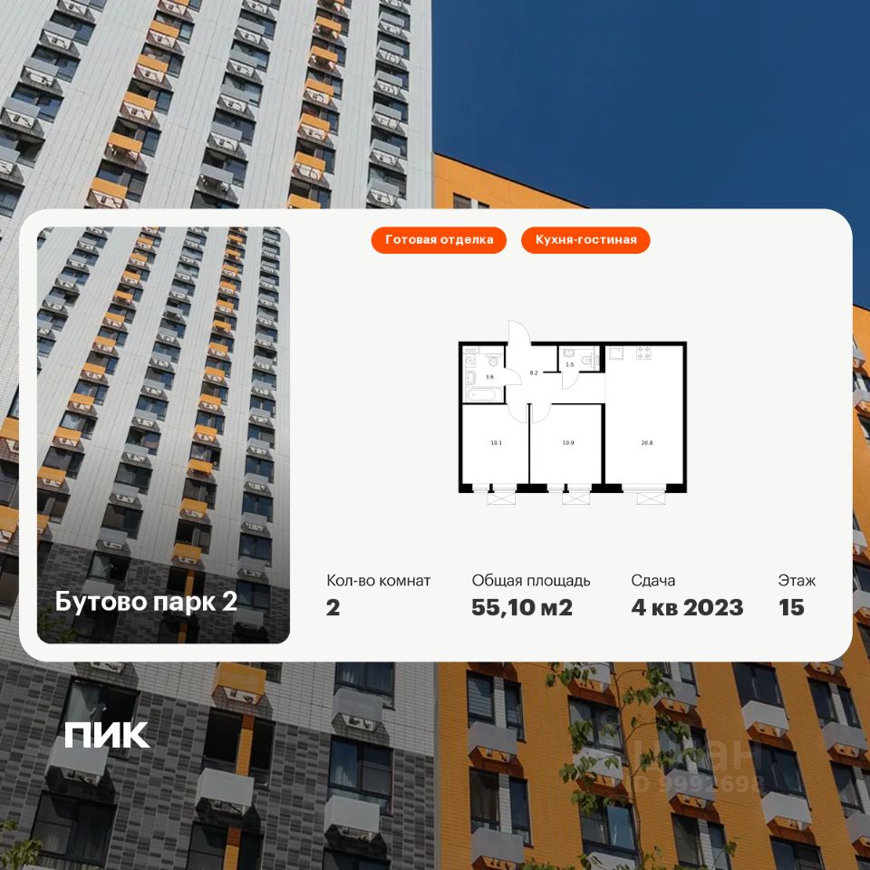Продаётся 2-комн. квартира площадью 55,1 кв.м на 15 этаже 17 этажного дома (Корпус 9-10.1, Секция 1) проекта ПИК Бутово парк 2. Светлый просторный подъезд на уровне земли, функциональная планировка, большие окна, c отделкой.
