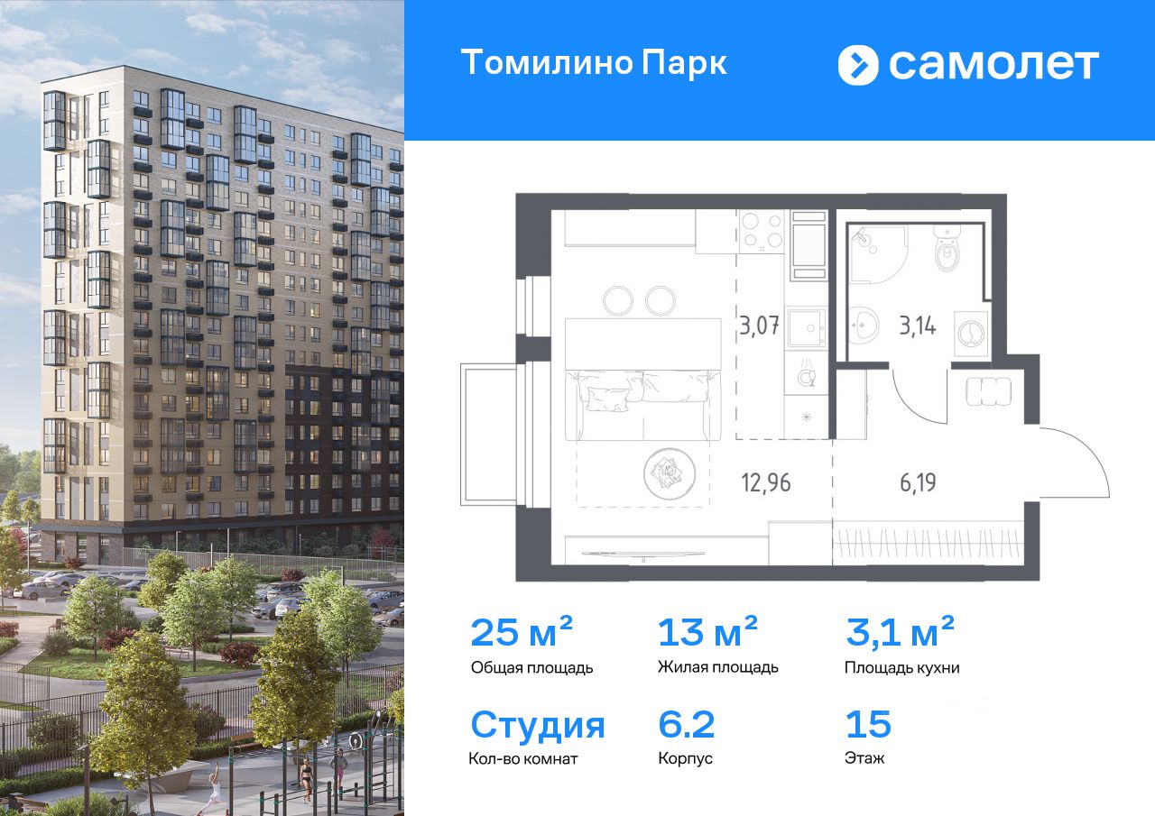 Предлагается квартира студия комфорт-класса 25 кв.м в корпусе 6.2 на 15 этаже, в ЖК ''Томилино Парк''