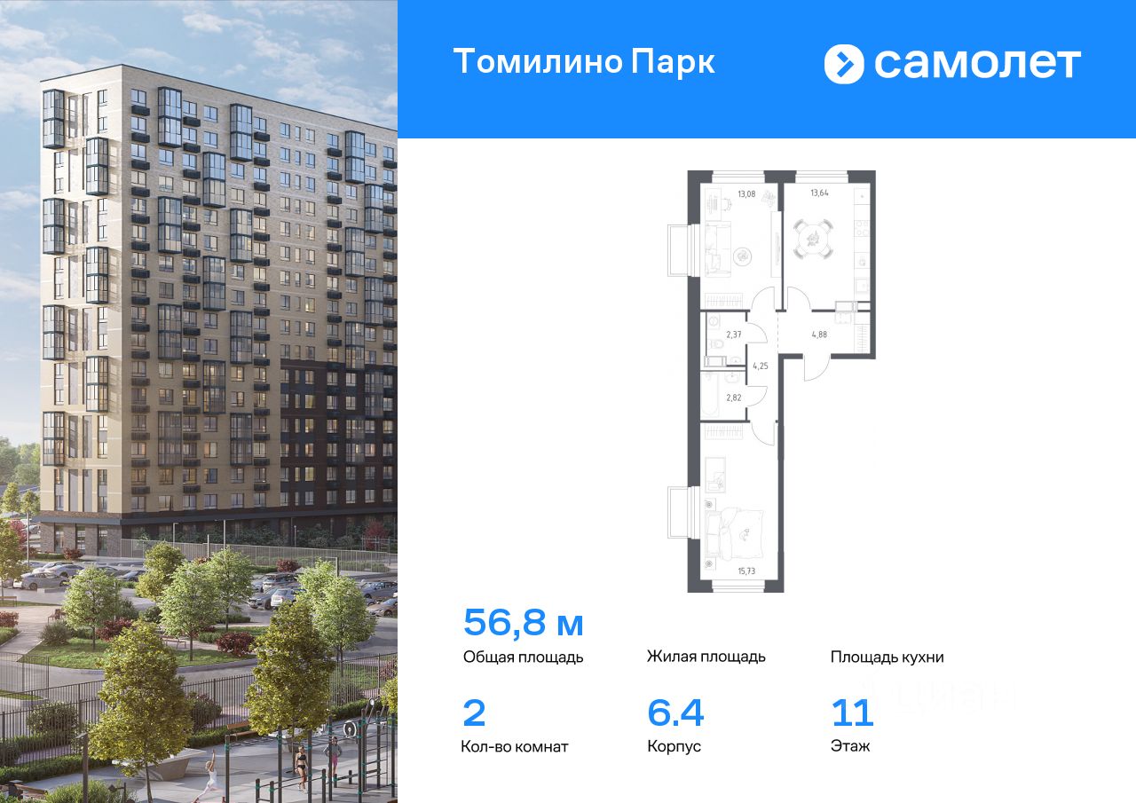 Предлагается 2-комнатная квартира комфорт-класса 56,77 кв.м в корпусе 6.4 на 11 этаже, в ЖК ''Томилино Парк'' Квартира без отделки. Доступность опции ''отделка'' и возможность комплектации мебелью и декором уточняйте у застройщика.