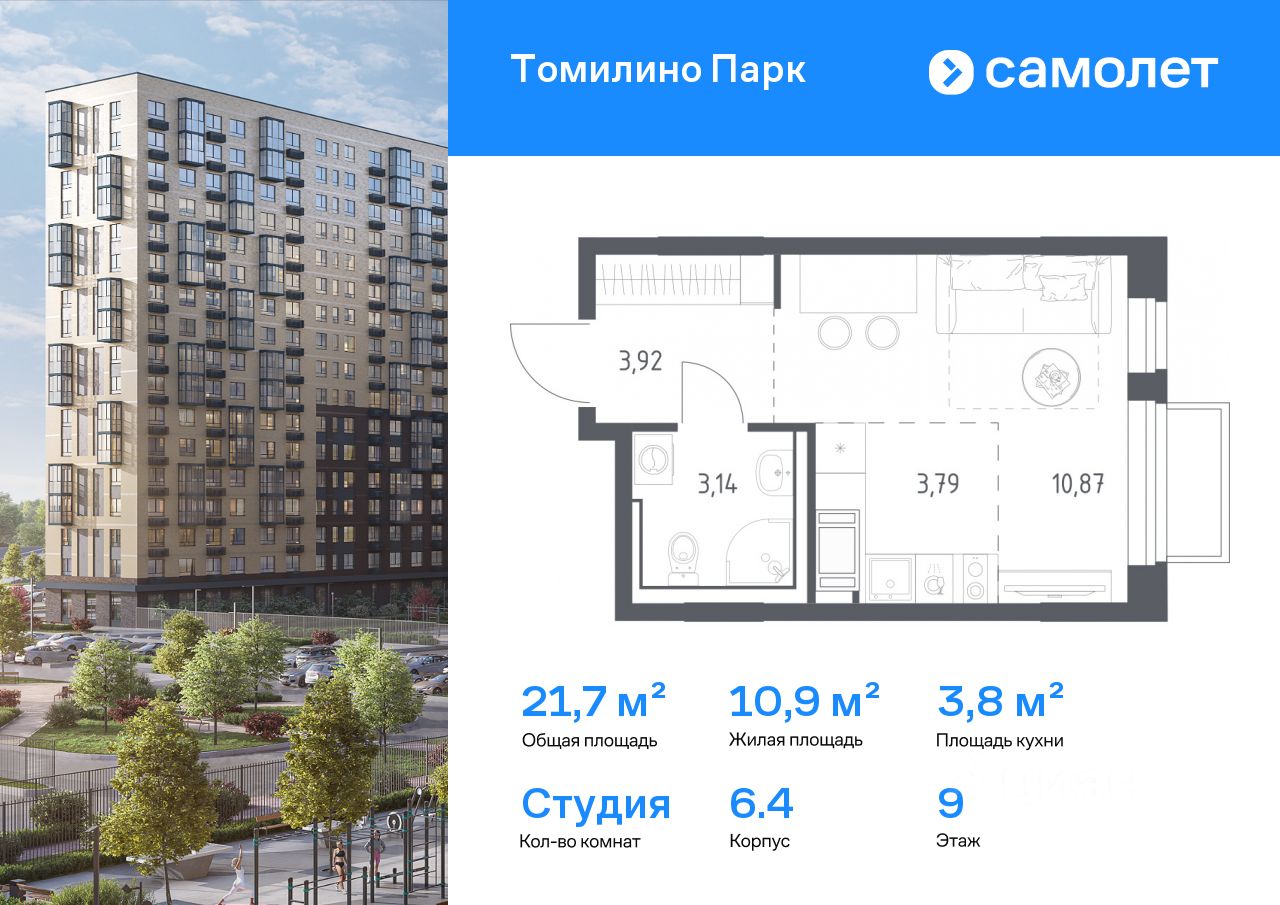 Предлагается квартира студия комфорт-класса 21,72 кв.м в корпусе 6.4 на 9 этаже, в ЖК ''Томилино Парк''