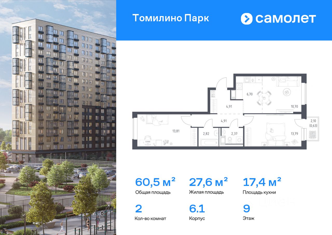 Предлагается 2-комнатная квартира комфорт-класса 60,5 кв.м в корпусе 6.1 на 9 этаже, в ЖК ''Томилино Парк''