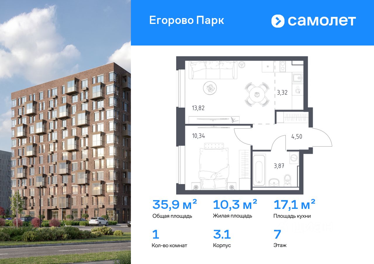 Предлагается 1-комнатная квартира комфорт-класса 35,85 кв.м в корпусе 3.1 на 7 этаже, в ЖК ''Егорово Парк''