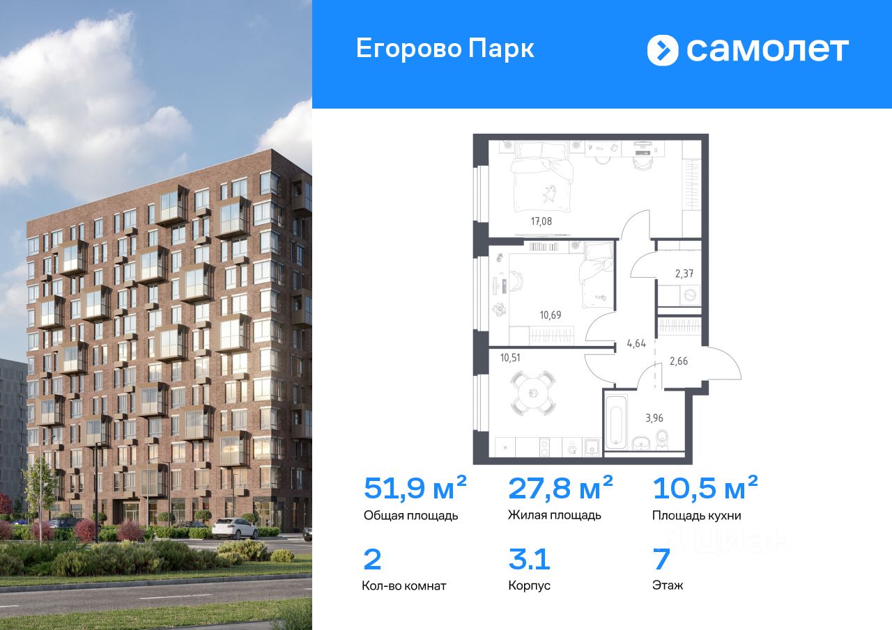 Строим кварталы для жизни с заботой о будущем. Предлагается 2-комнатная квартира комфорт-класса 51,91 кв.м в корпусе 3.1 на 7 этаже, в ЖК ''Егорово Парк''