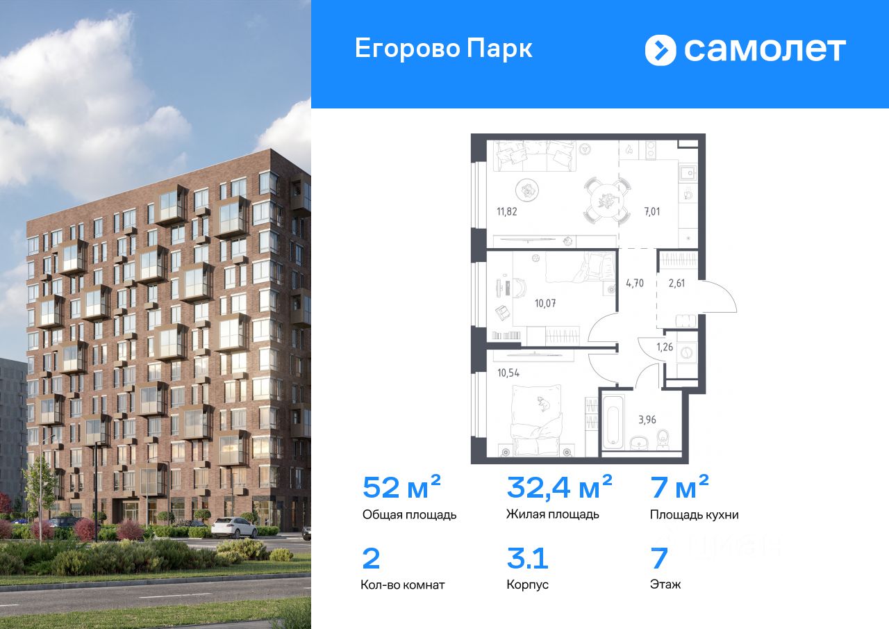 Предлагается 2-комнатная квартира комфорт-класса 51,97 кв.м в корпусе 3.1 на 7 этаже, в ЖК ''Егорово Парк''