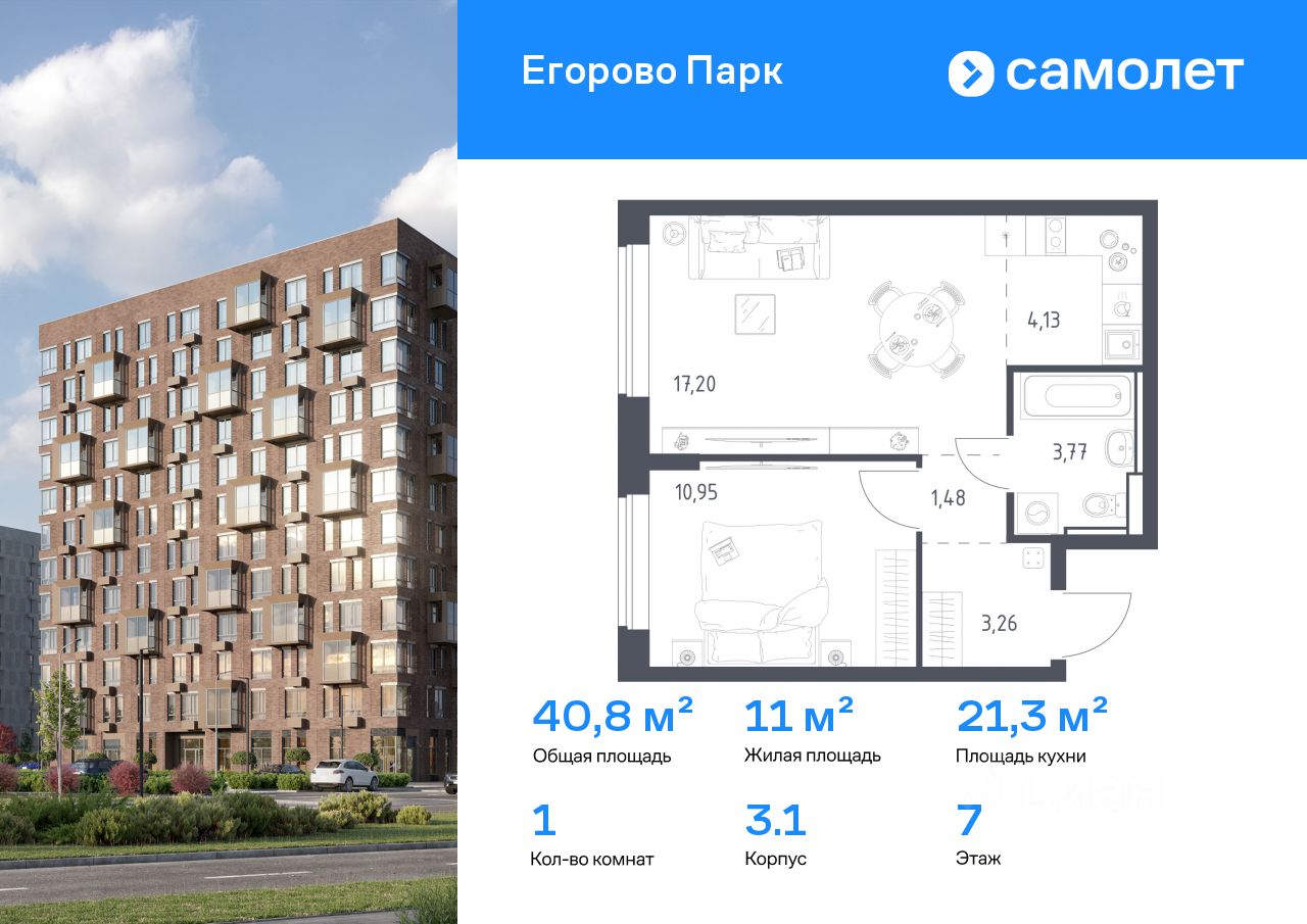 Строим кварталы для жизни с заботой о будущем. Предлагается 1-комнатная квартира комфорт-класса 40,79 кв.м в корпусе 3.1 на 7 этаже, в ЖК ''Егорово Парк''