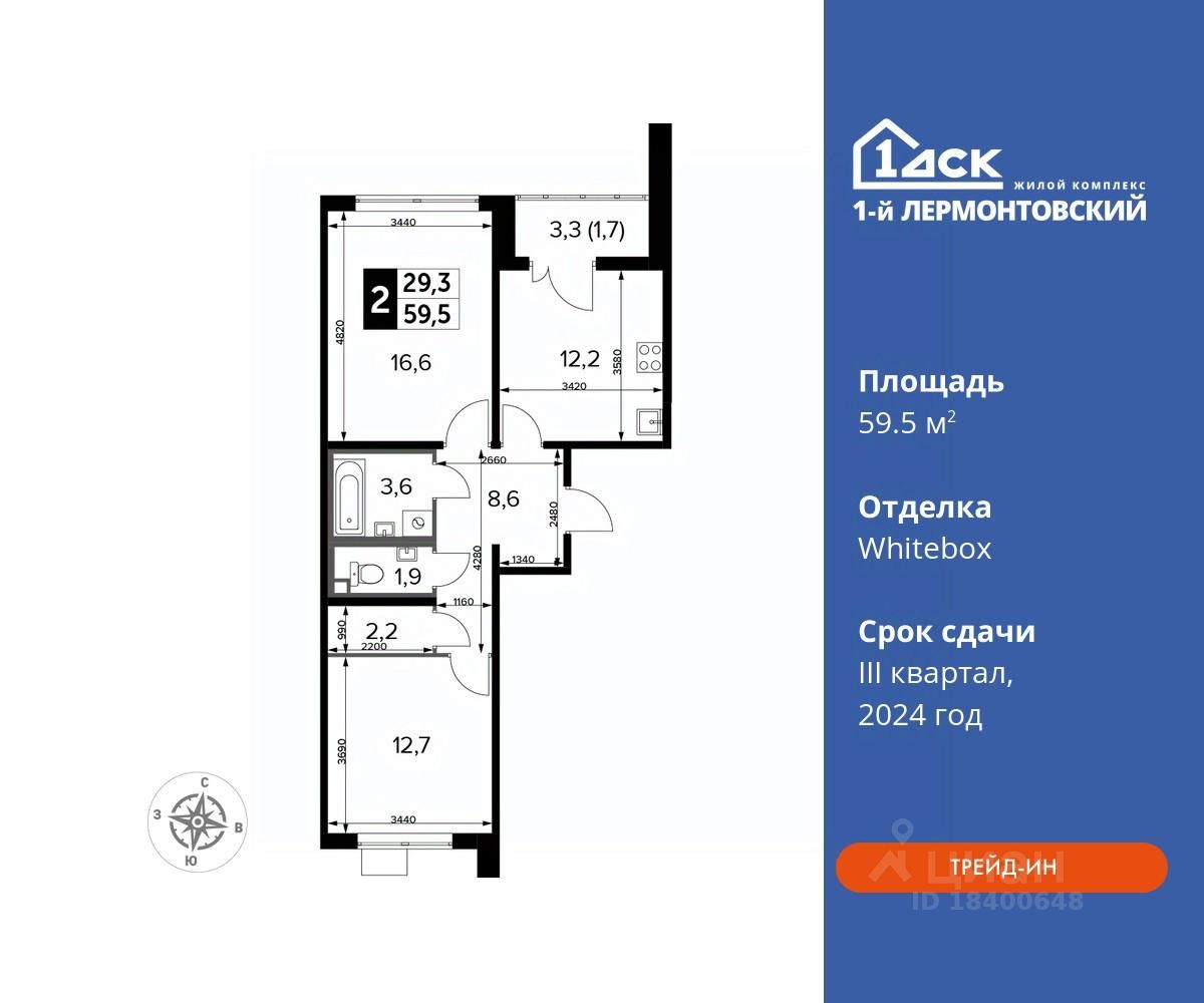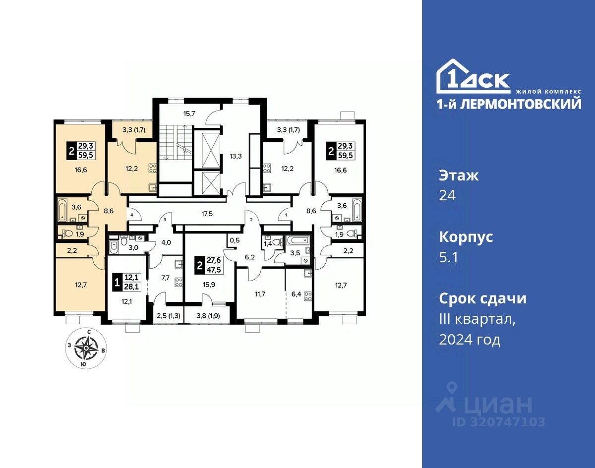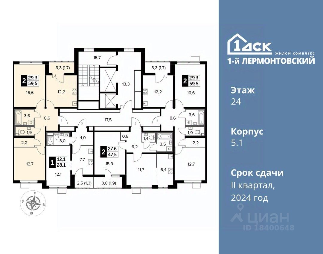 Максимальные скидки при 100% оплате. Корпус сдан! Прямая продажа от застройщика! Жилой Комплекс класса Комфорт плюс. Продаётся 2-к квартира номер 529 в сданном корпусе общей площадью 59.5 кв.м на 24-м этаже 24 этажного дома.