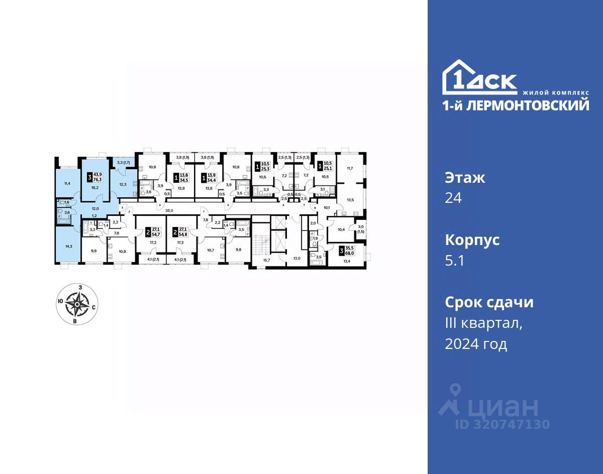 Максимальные скидки при 100% оплате. Корпус сдан! Прямая продажа от застройщика! Жилой Комплекс класса Комфорт плюс. Продаётся 3-к квартира номер 340 в сданном корпусе общей площадью 76.3 кв.м на 24-м этаже 24 этажного дома.