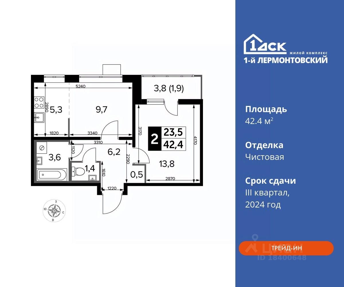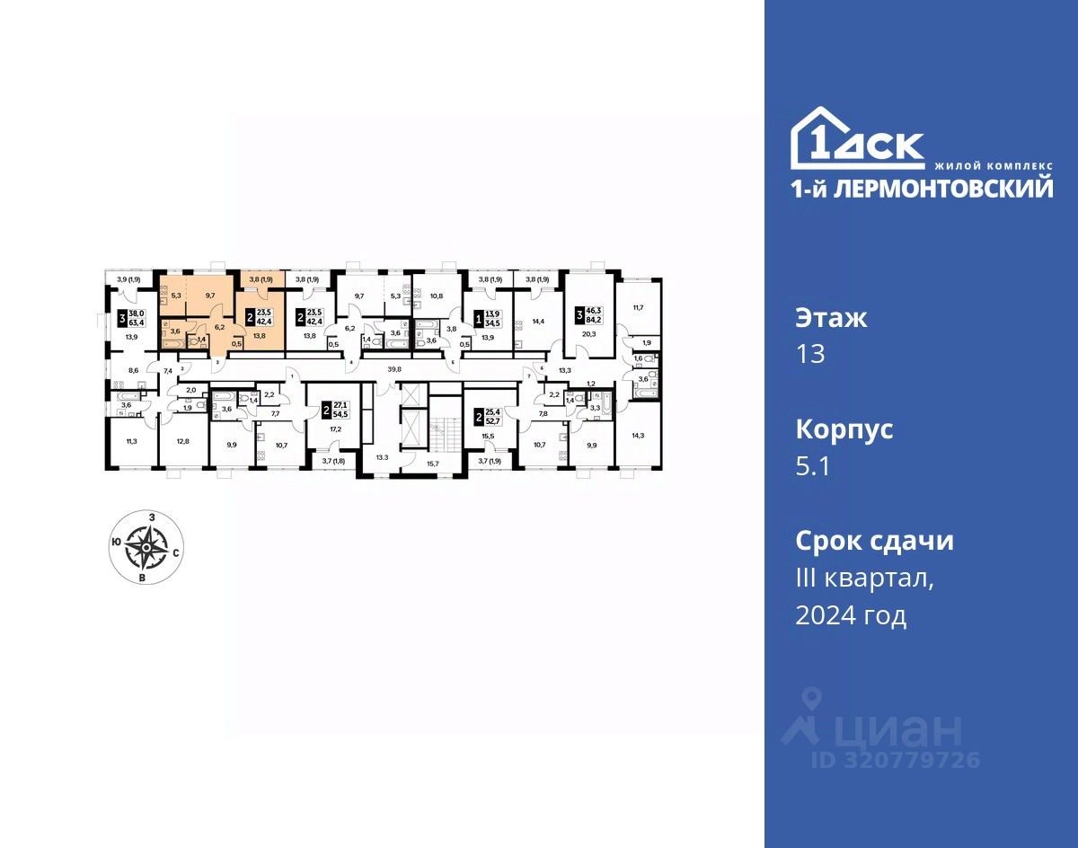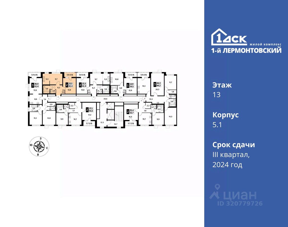 Максимальные скидки при 100% оплате. Корпус сдан! Прямая продажа от застройщика! Жилой Комплекс класса Комфорт плюс. Продаётся 2-к квартира номер 80 в сданном корпусе общей площадью 42.4 кв.м на 13-м этаже 24 этажного дома.