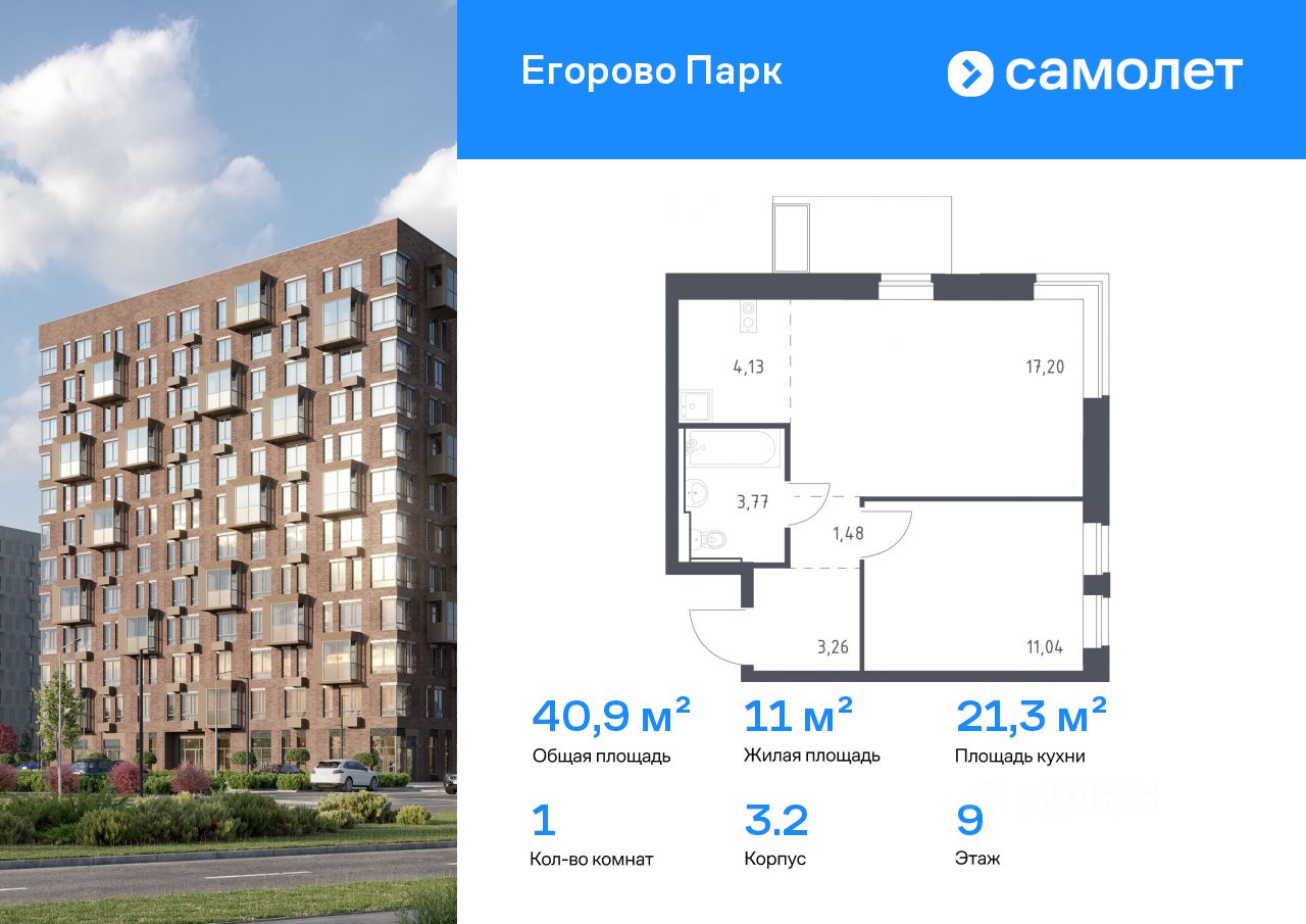 Предлагается 1-комнатная квартира комфорт-класса 40,88 кв.м в корпусе 3.2 на 9 этаже, в ЖК ''Егорово Парк''