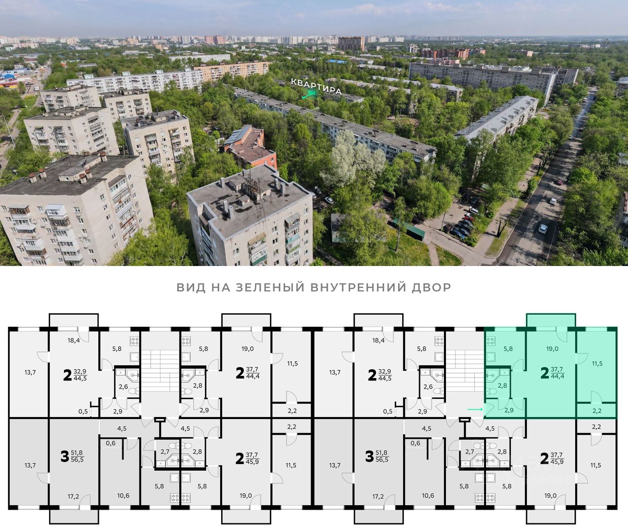Общая площадь квартиры согласно ЕГРН составляет 44.3м2, а учитывая балкон 45.7м2. Высота потолков — 2,5 метра. Дом без лифта. На этаже 4 квартиры.