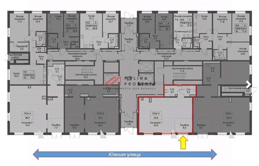 Помещение площадью 69,8 м2, располагается на 1 этаже, открытая планировка, отдельный вход, высота потолка 4 м, витринные окна по фасаду. Место для размещения рекламы. Располагается на 1-й линии домов.