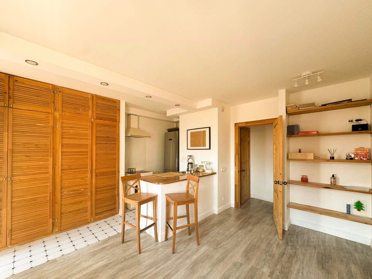 вместительный шкаф для вещей, кухня с необходимой техникой, барная стойка с