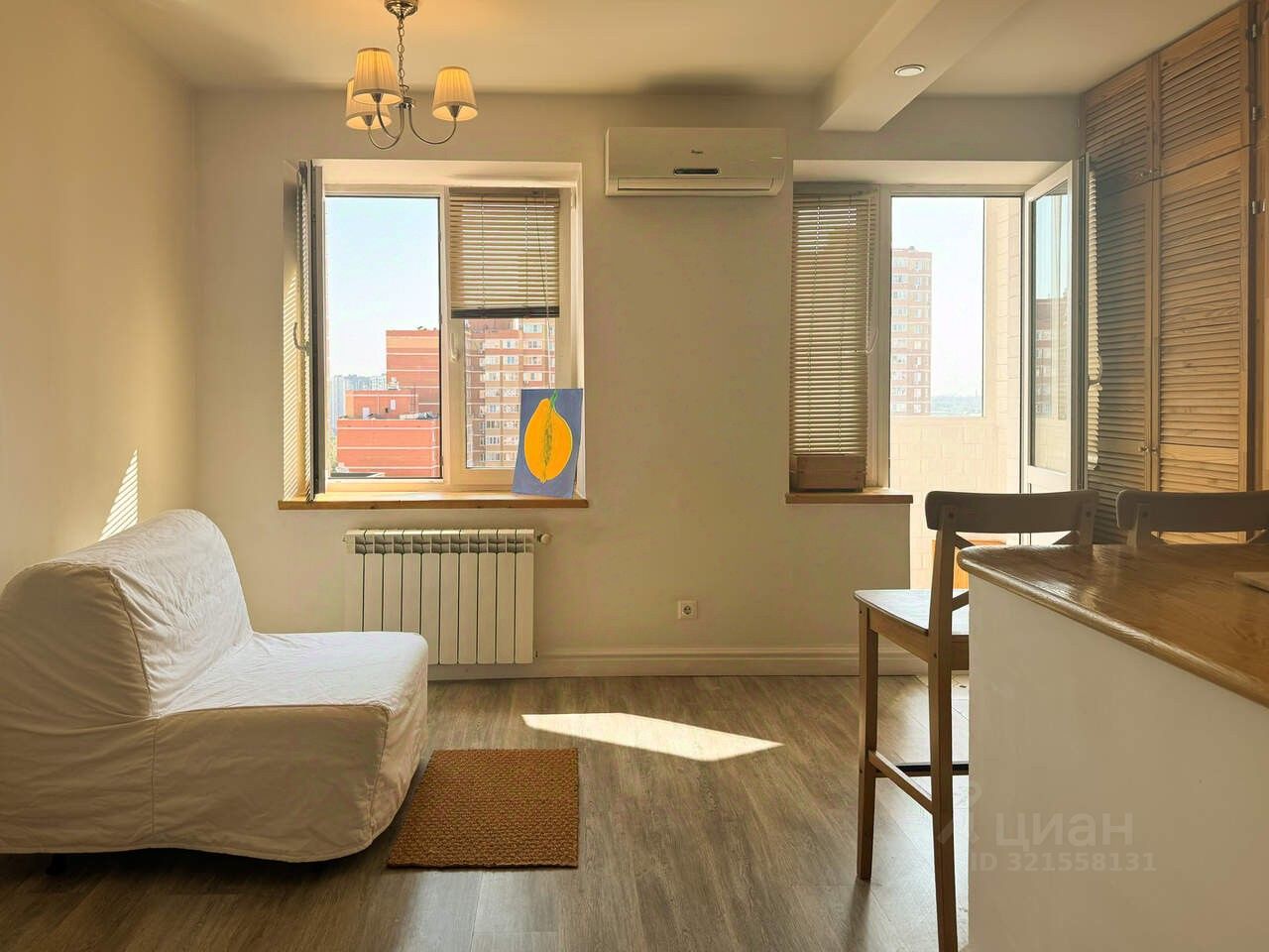 на 18 этаже в ЖК ''Академический''. Белые стены, натуральная деревянная мебель,