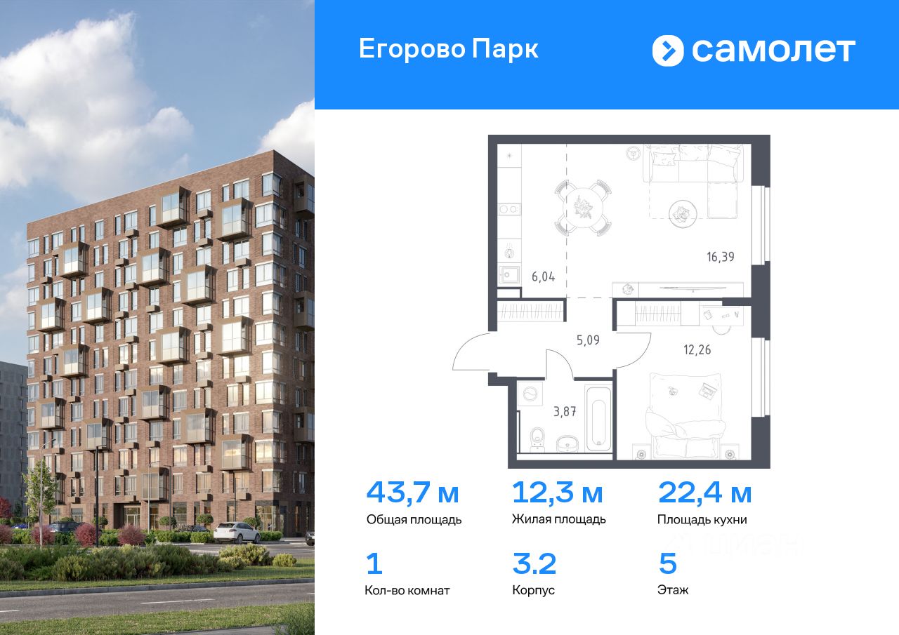 Строим кварталы для жизни с заботой о будущем. Предлагается 1-комнатная квартира комфорт-класса 43,65 кв.м в корпусе 3.2 на 5 этаже, в ЖК ''Егорово Парк''
